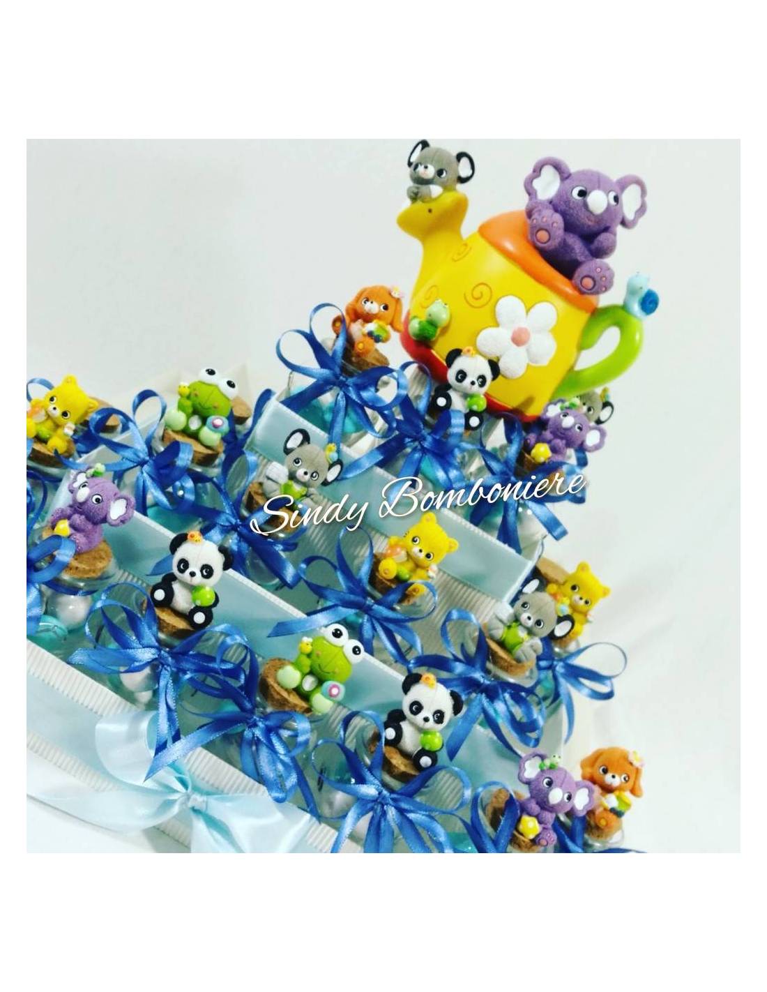 Torta bomboniera Battesimo vasetti portaconfetti con animaletti per bimbo