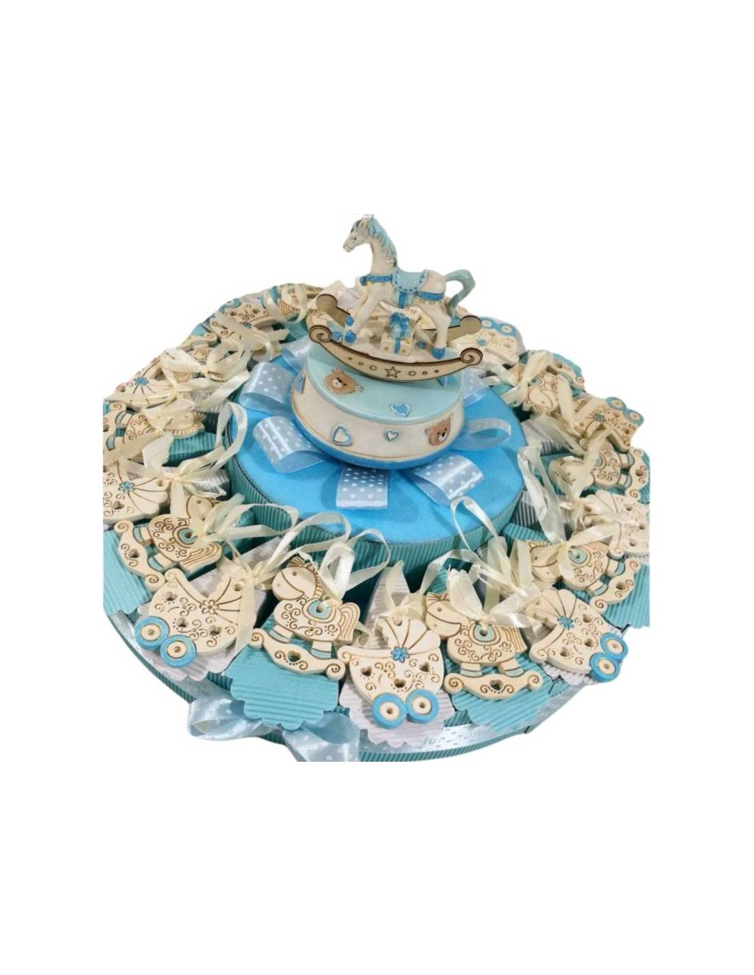 Torta bomboniere da 20 fette con pendenti a forma di cavalluccio a dondolo e carrozzina.