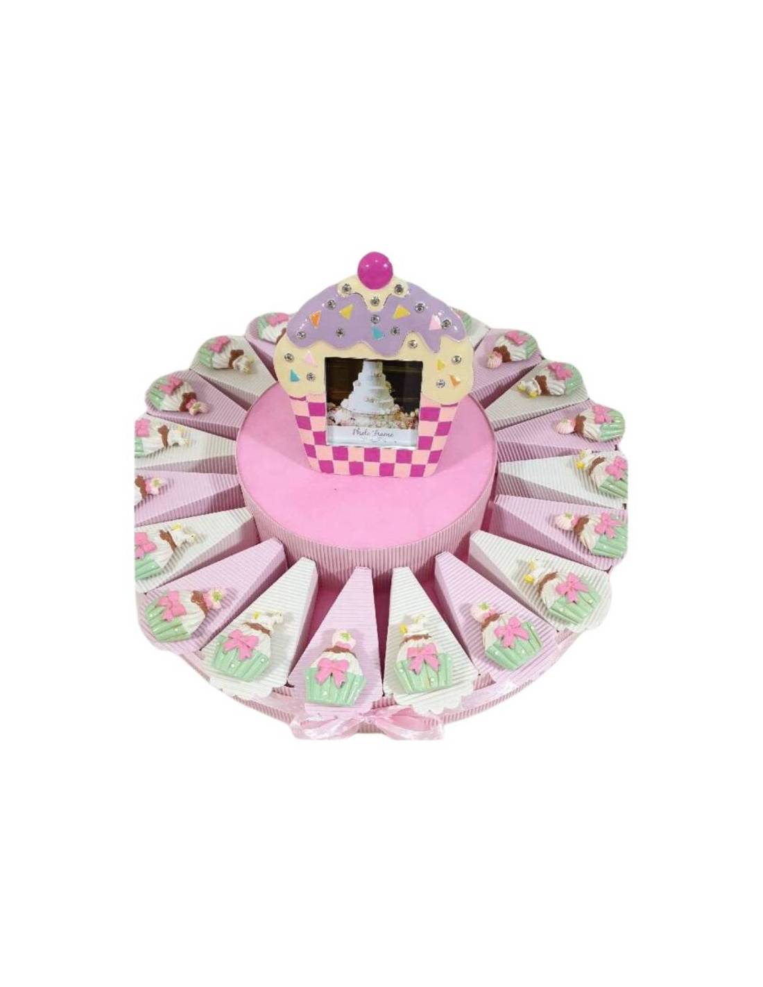 Puoi confezionare con le tue mani la torta di bomboniere pagliaccio in quanto la struttura è montata e decorata con nastri, basterà chiudere le fette e attaccare gli oggetti.