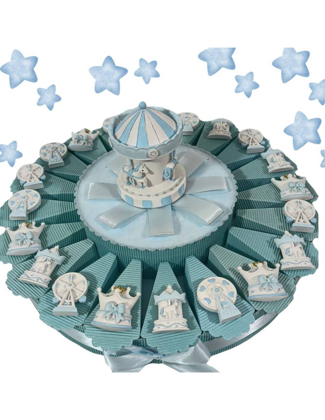 Calamite maschio bomboniere torta che rappresentano la giostra di cavalli, corona e panoramica nei colori bianco e celeste con carillon centrale.