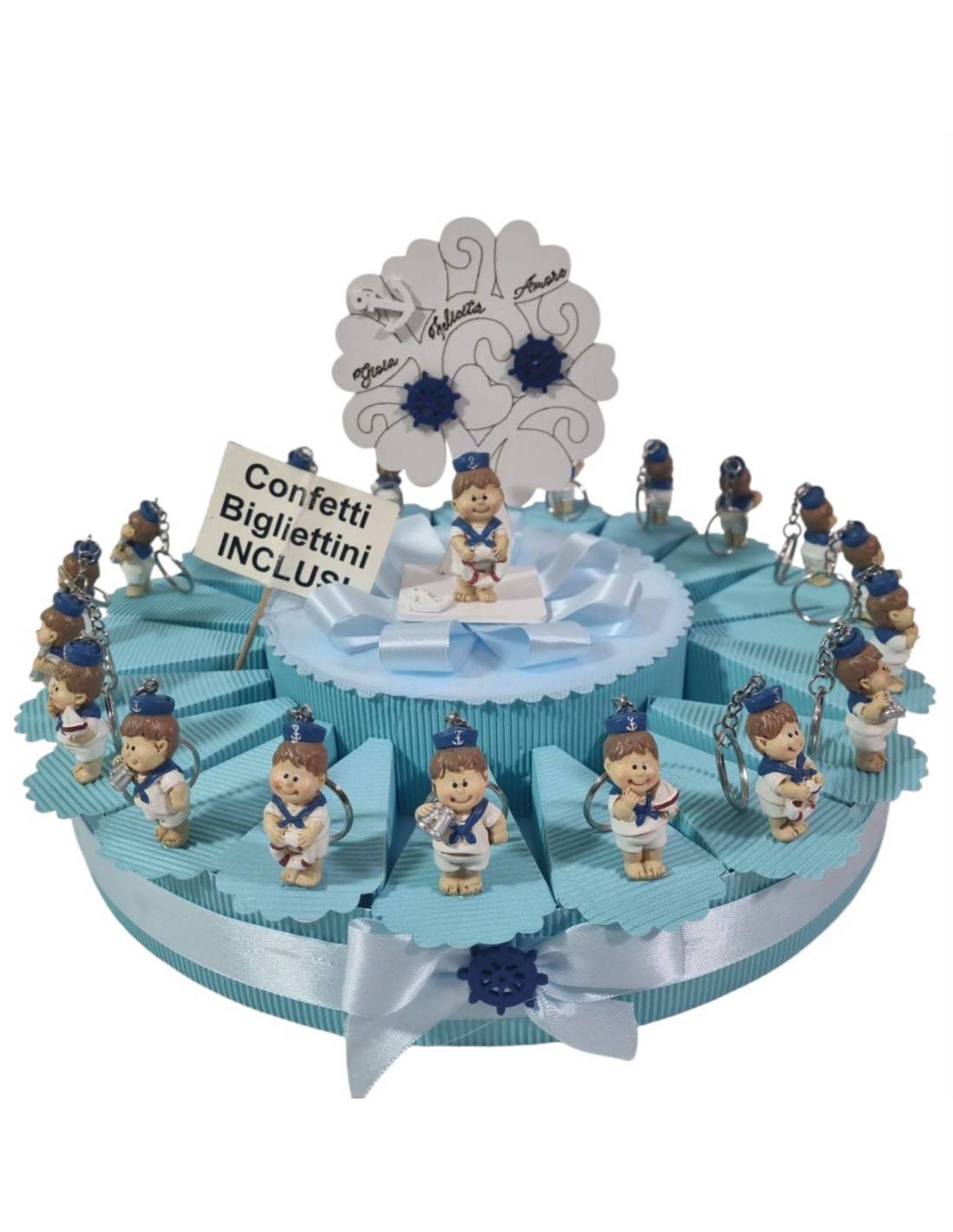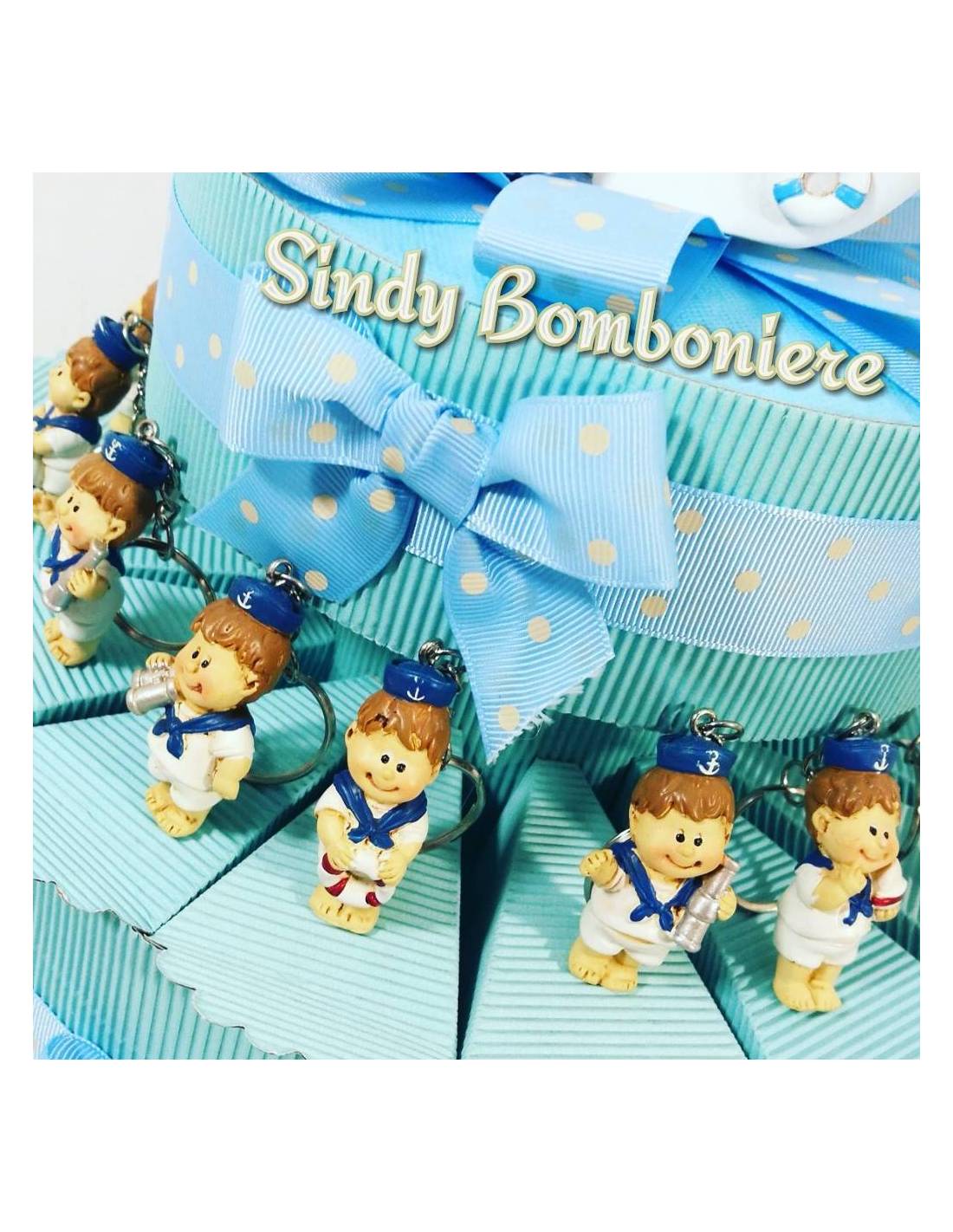 Bomboniere per battesimo stile mare bimbo marinaio MARINES a forma di TORTA BOMBONIERA. Idee originali bomboniere marine per maschietto bimbo marinaretto portachiavi con binocolo, barchetta, salvagente, cannocchiale dimensione senza la catenina 5 cm circa con catena 10 cm. la torta in foto è composta da 20 fette con i marinai portachiavi e compreso nel prezzo il centrale PORTAFOTO barca a vela con bimbo marinaio dimensione di 10,5 cm circa.