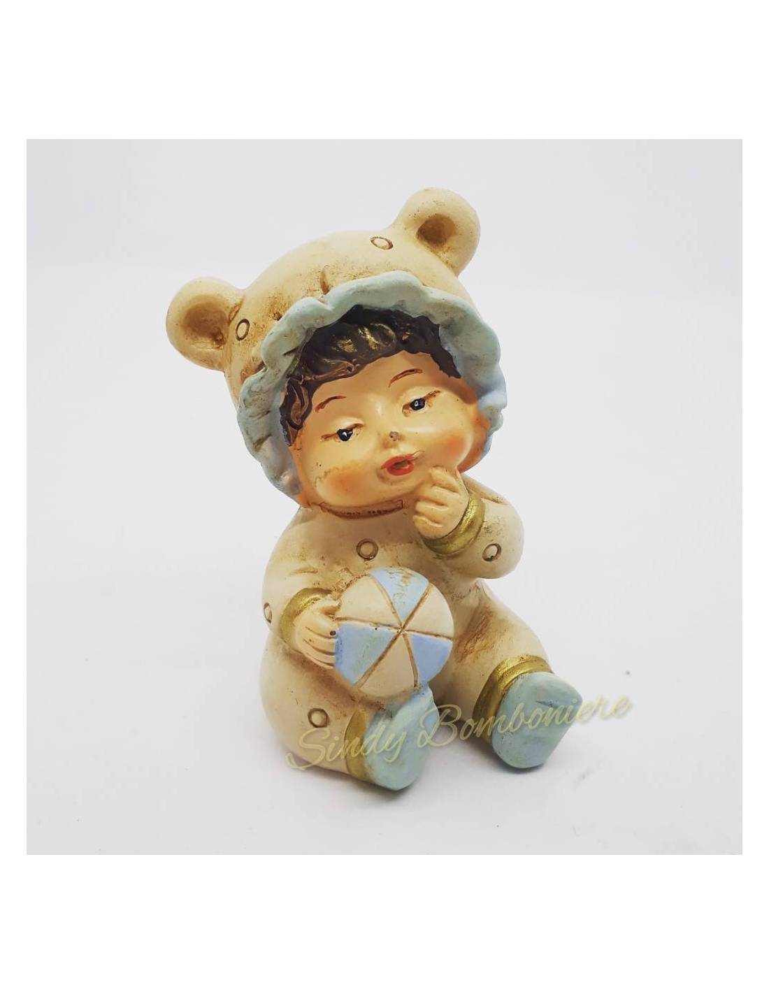 Il bimbo che rappresenta la bomboniera è in resina dipinta a mano ed è un oggetto da appoggio che misura 6x3 cm circa.