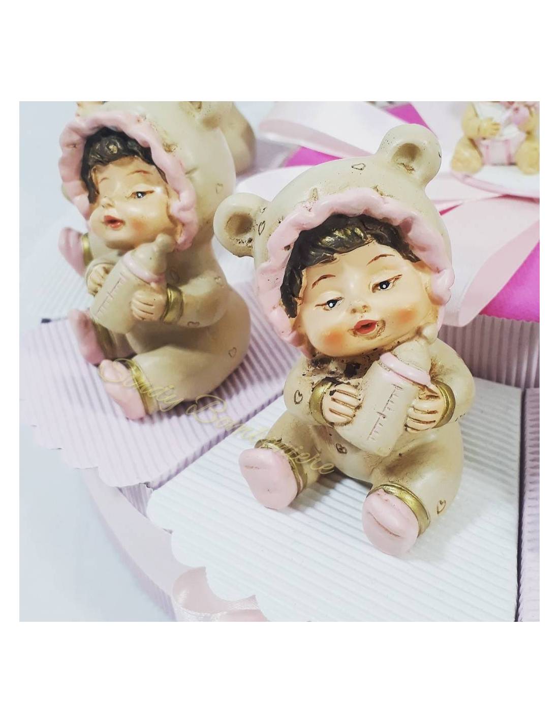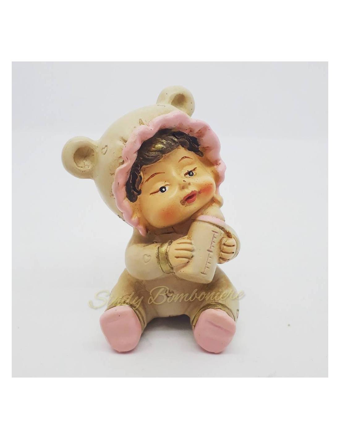 La bomboniera per bambina su torta è di resina dipinta a mano è un oggetto da appoggio che misura 6x3 cm circa e raffigura una dolce femminuccia con una tutina dall'orlo del cappuccio rosa che stringe tra le mani un biberon.