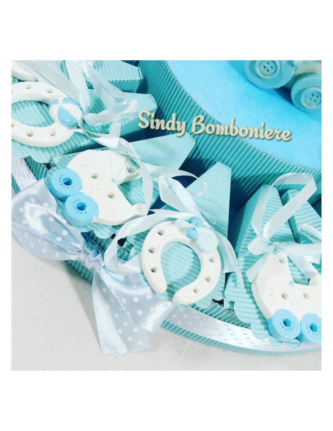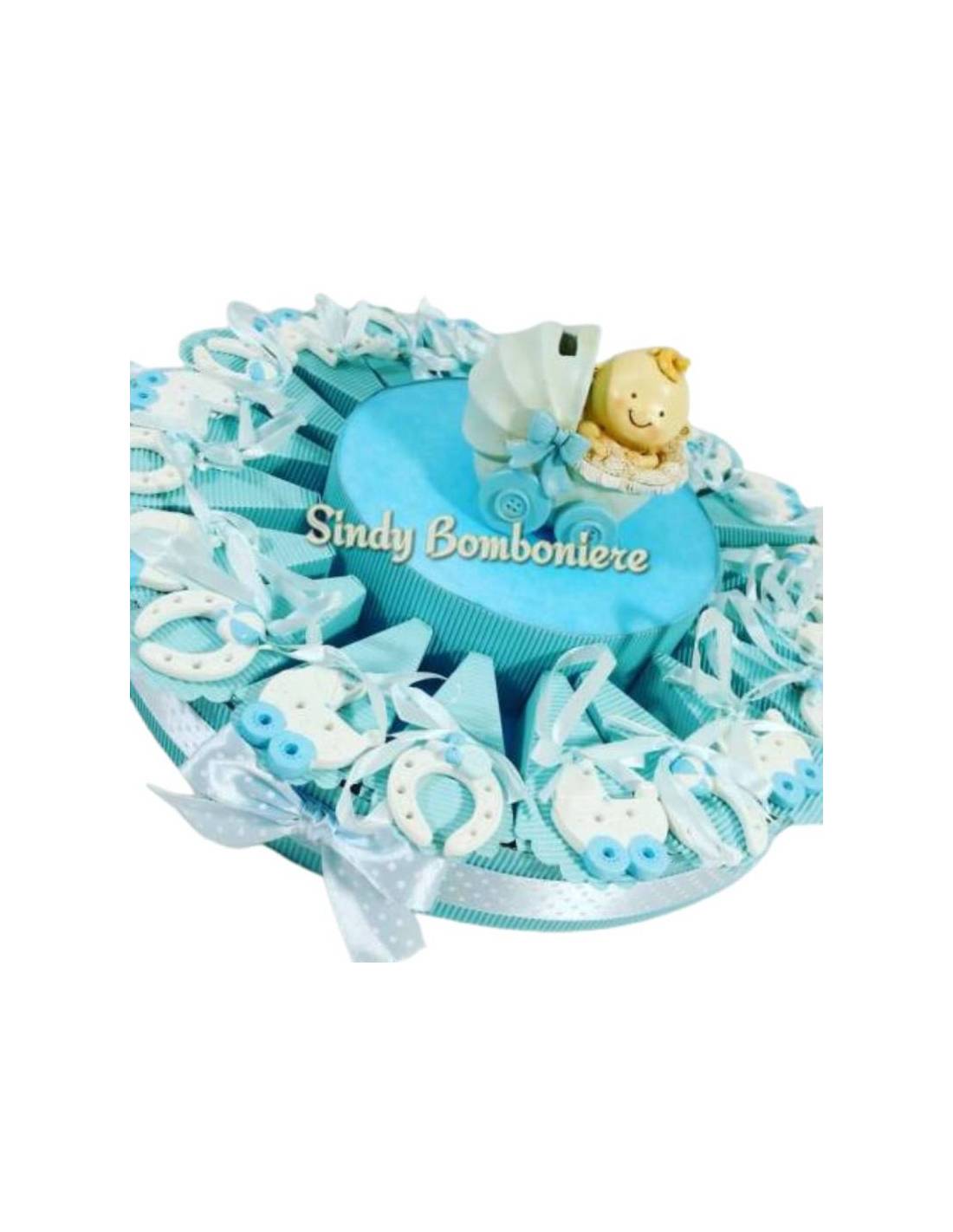 TORTA BOMBONIERA ciondolo ferro di cavallo e carrozzina nascita battesimo 1° compleanno