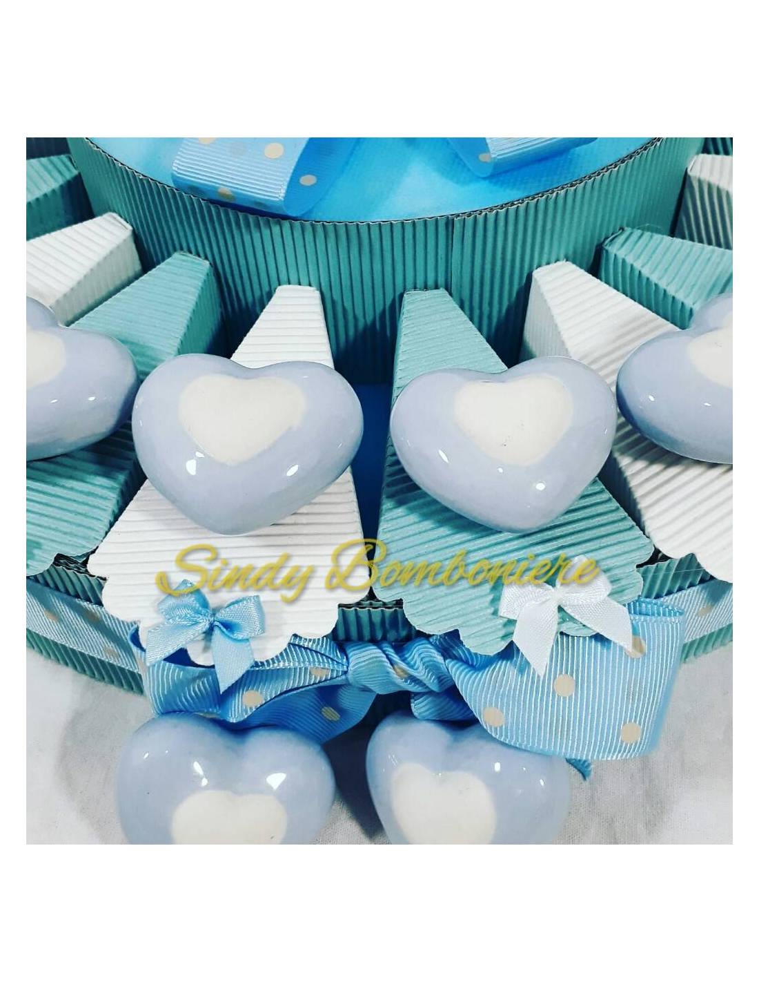 La torta bomboniere cuori arriverà montata con nastri come da foto, mentre le fette dovrai sistemarle tu. Ti basterà incollarle con biadesivo o colla al caldo dopo averci inserito all'interno i confetti.