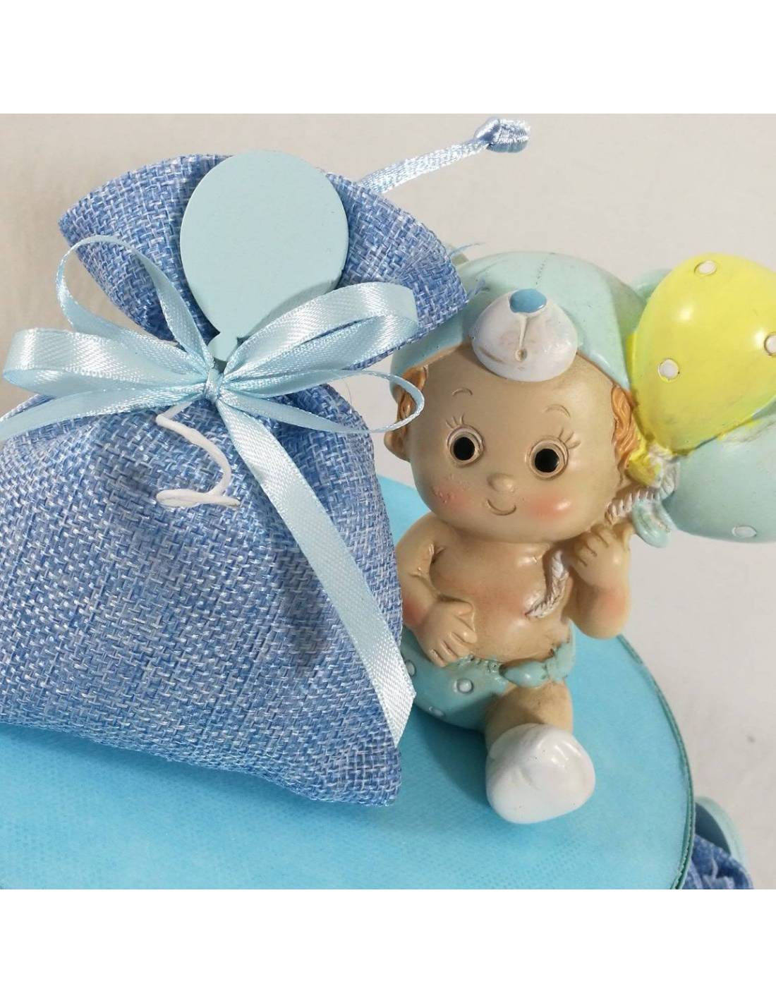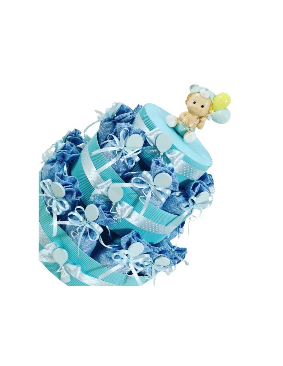 Torta bomboniere per sacchetti azzurri juta. La torta porta sacchetti è molto bella da presentare sul tavolo del Battesimo del vostro bimbo.
