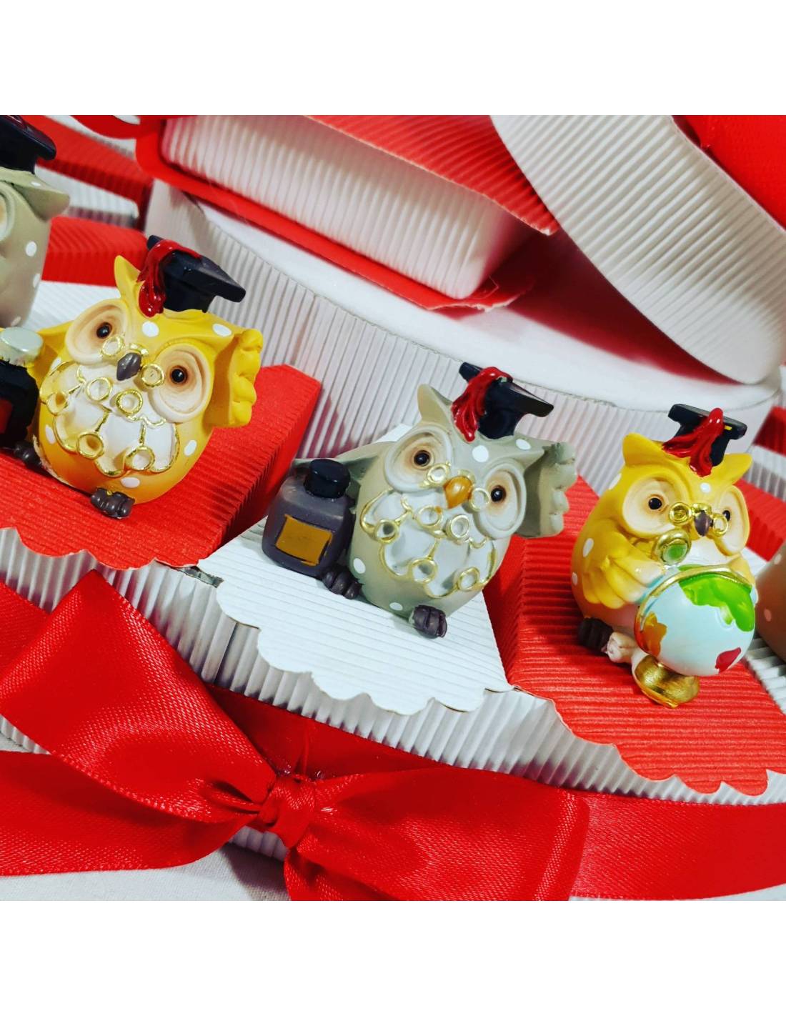 Torta con bomboniere laurea gufetti assortiti colorati