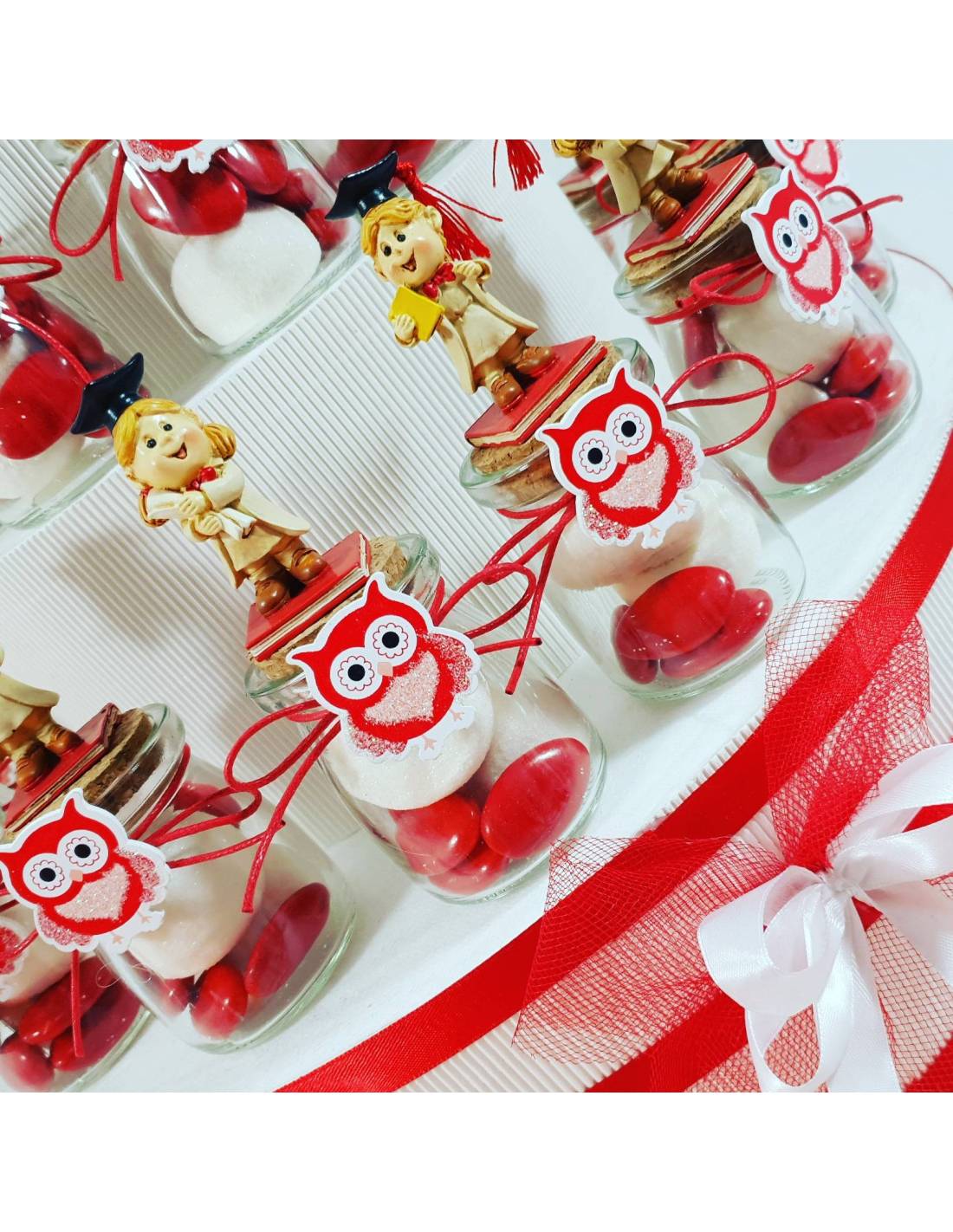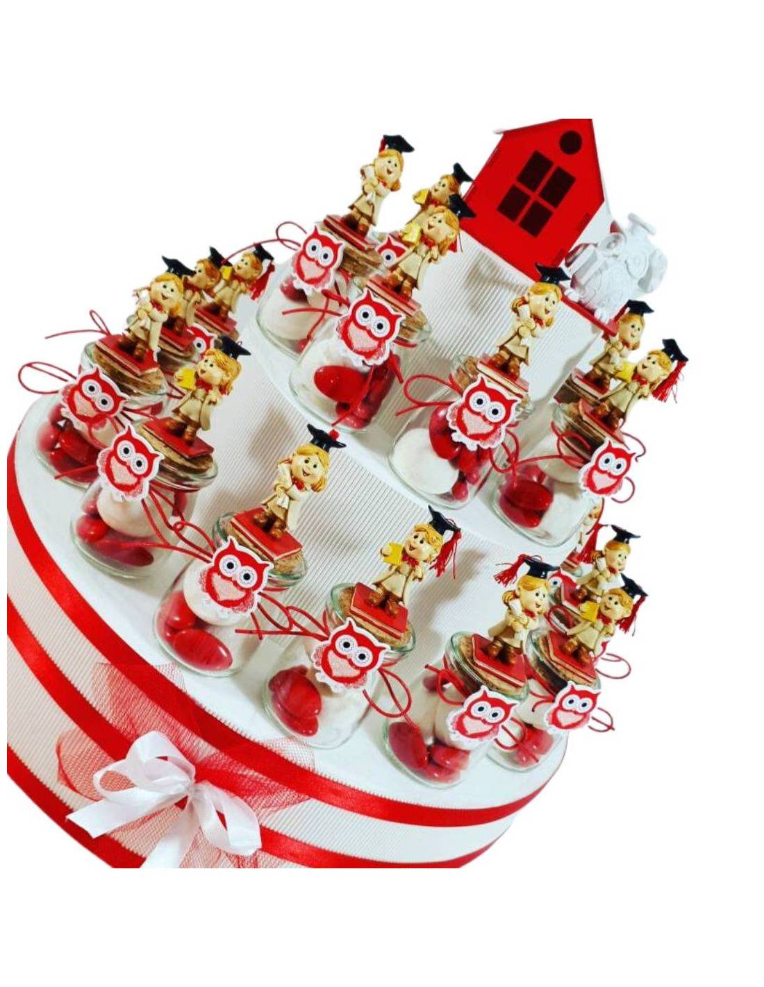 Torta espositiva decorata a tema laurea, composta da 25 vasetti in vetro confezionati con confetti e bigliettini. Ogni vasetto è decorato con un bellissimo fiocchetto con su applicato un gufetto bianco e rosso. Su ogni tappo è presente una bambina in resina con pose assortite. Queste bomboniere sono utili come contenitori portaspezie, miele, marmellata, portacaramelle, portaconfetti, decorativi e pensierini originali per il giorno della tua laurea.