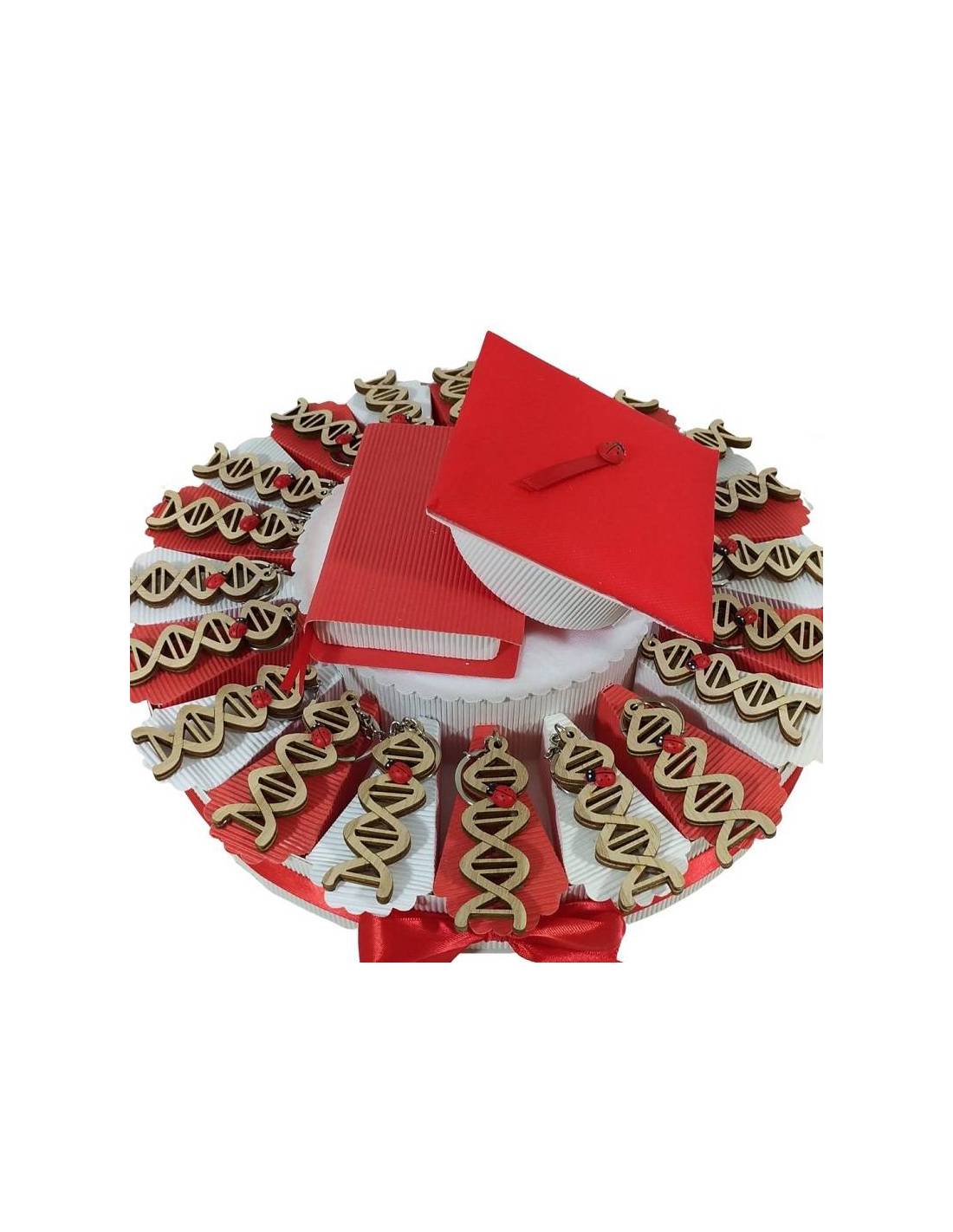 Torta bomboniera laurea DNA laureato e confetti rossi, per ogni torta è incluso il centrale tocco e tesi.