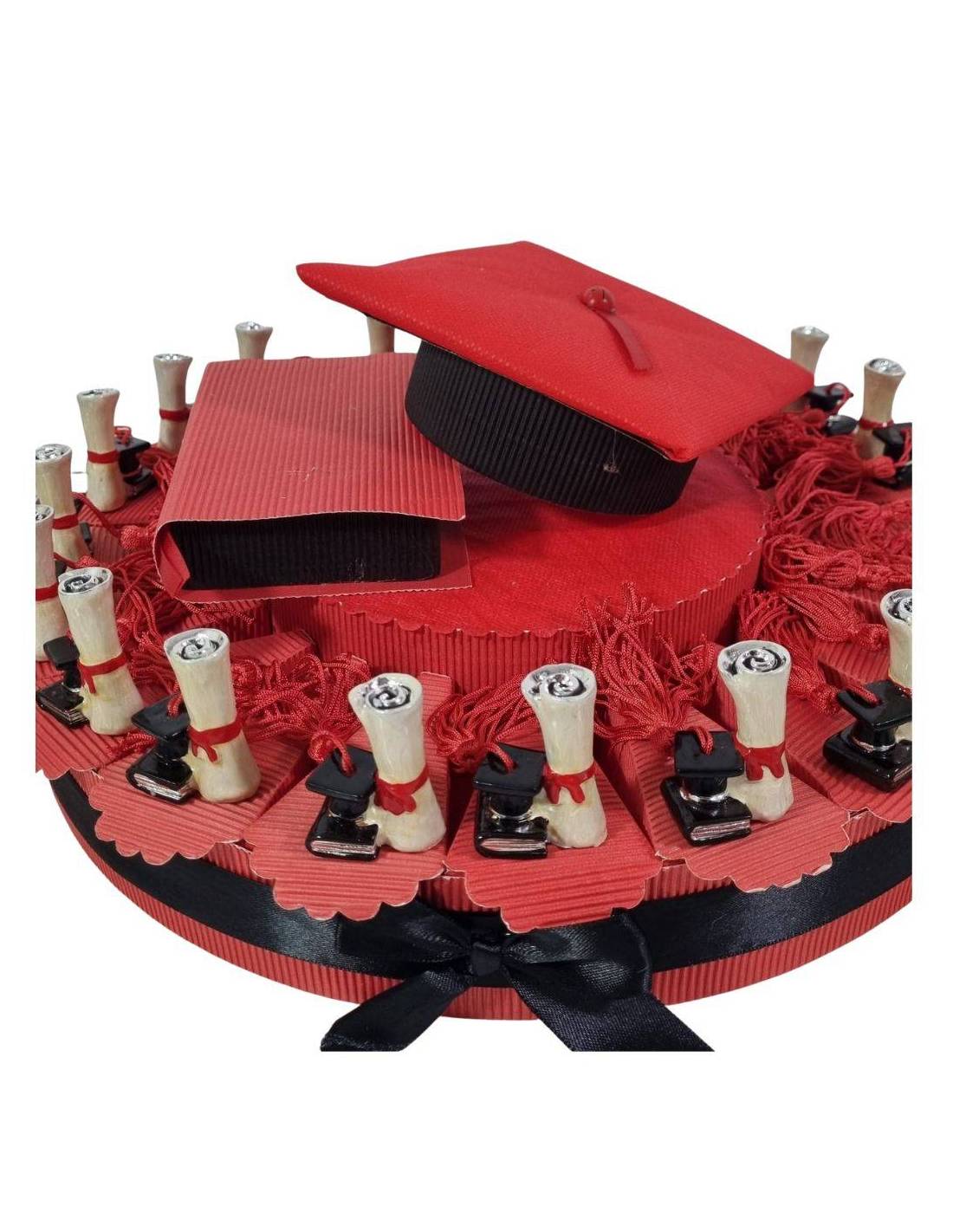 Torta di bomboniere laurea statuette che rappresentano la pergamena, libro e tocco nero e nappa rossa.