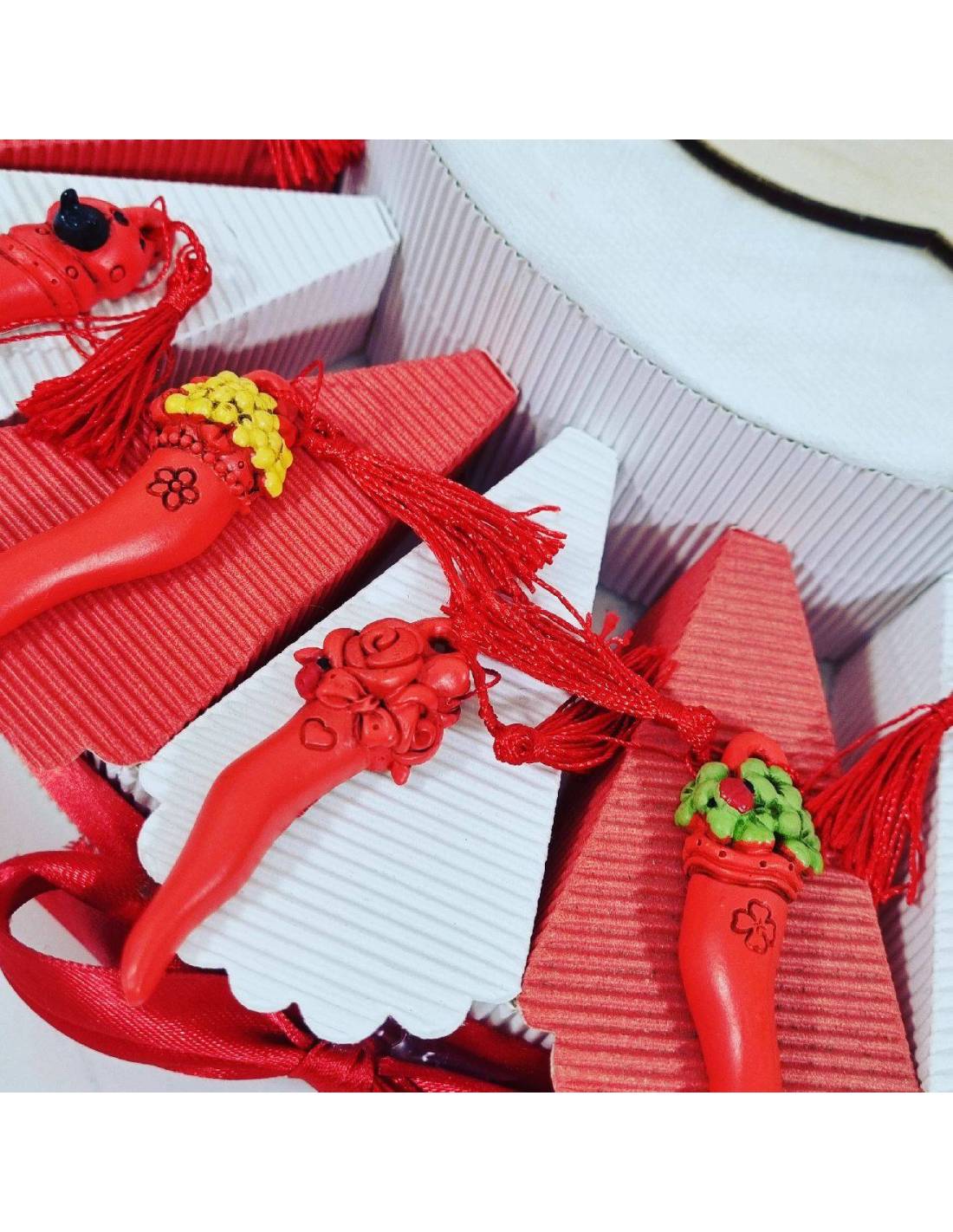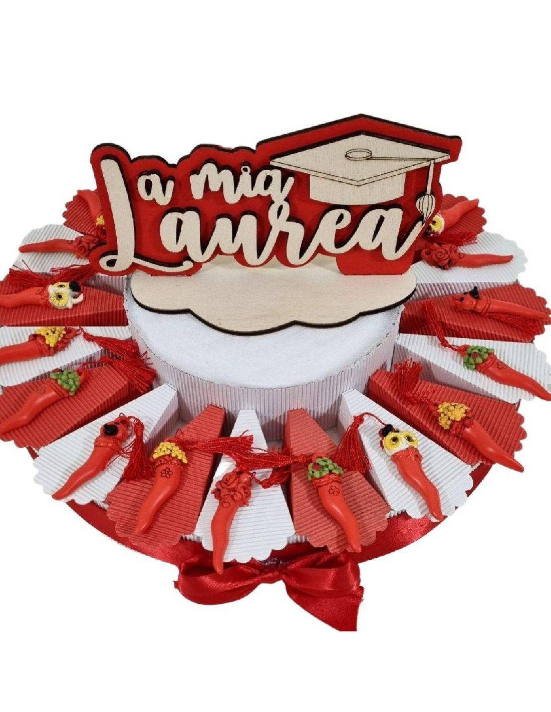 Corno rosso portafortuna con nappa rossa confezionato su torta confetti laurea a prezzi bassi ma di ottima qualità.