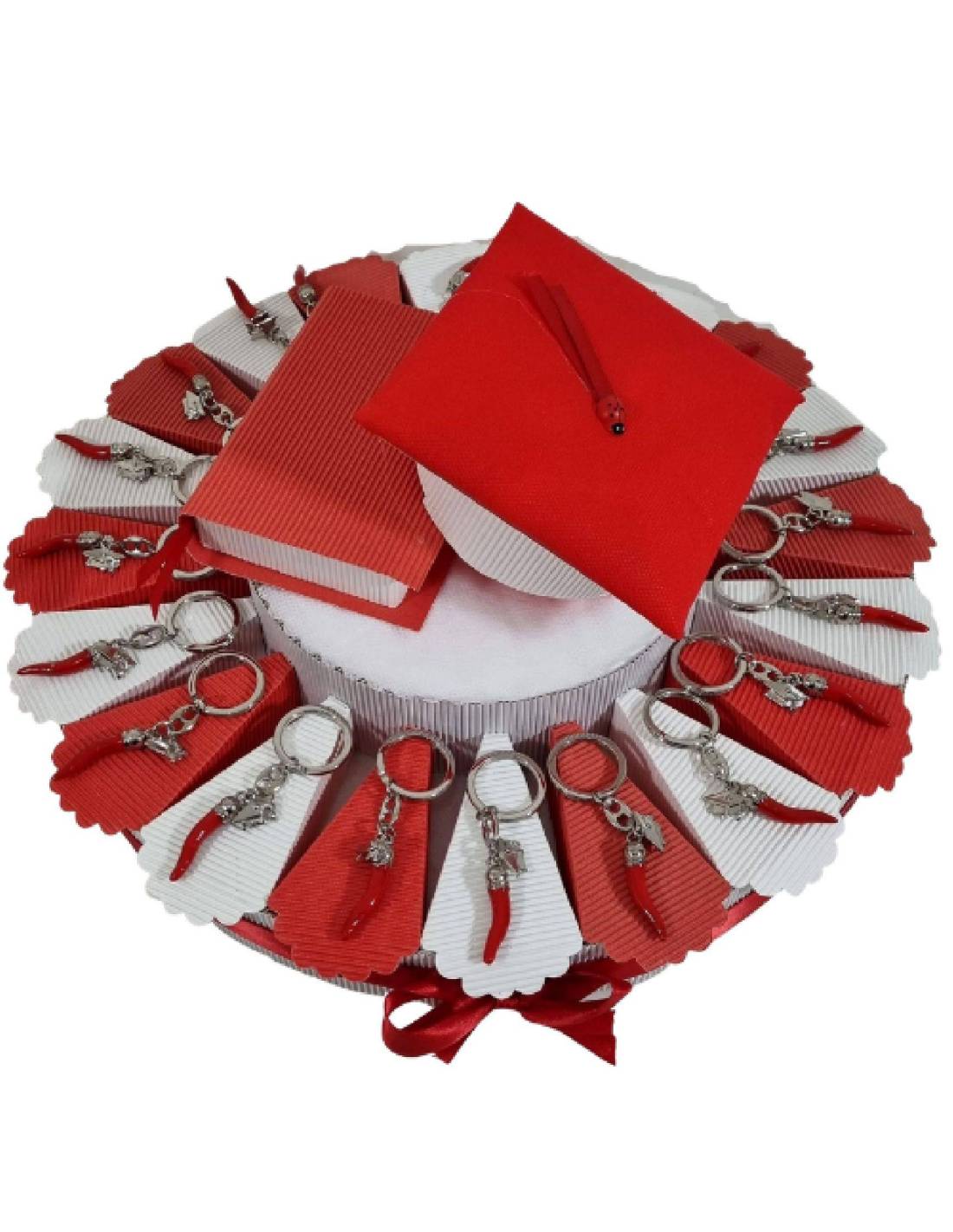 Torta bomboniere laurea portachiavi con corno rosso e tocco argentato ideali per ogni facoltà.
