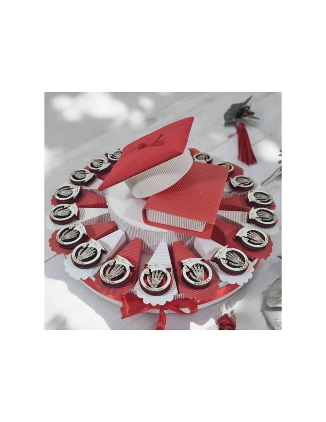 La torta è di colore bianco e rosso, che ricordano i colori della laurea, e decorata con dei nastri e fiocchi in raso rosso. Ogni fetta è composta da confetti, bigliettini e bomboniera portachiavi in microfusione portachiavi che rappresenta una...