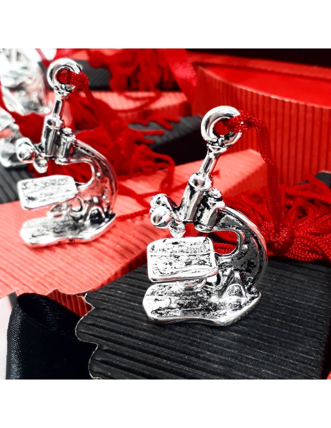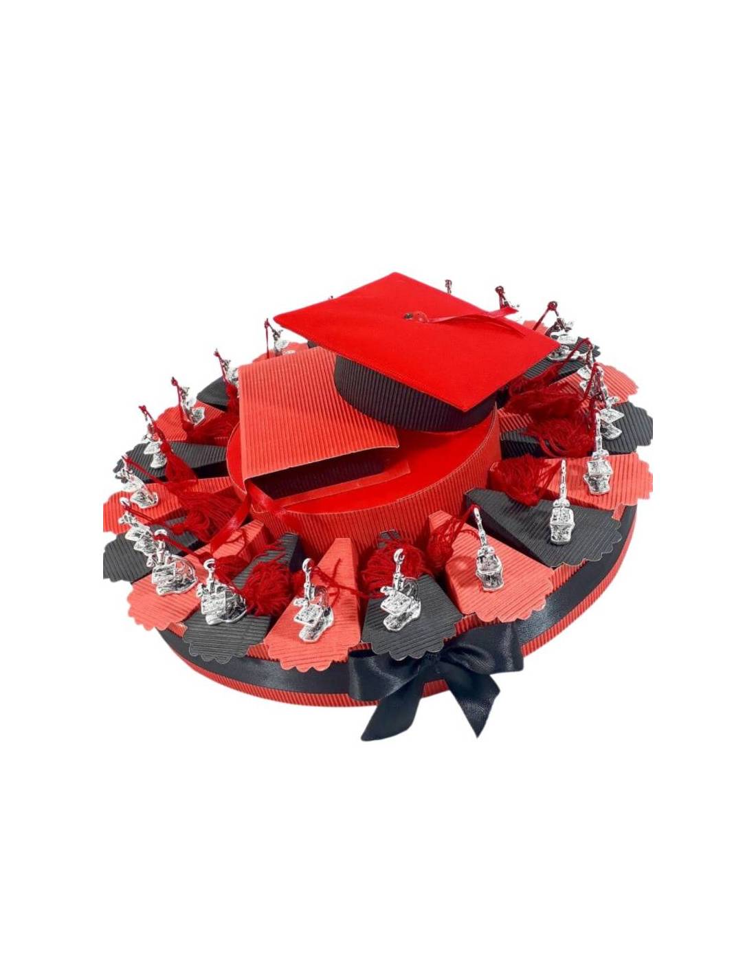 Bellissima torta di bomboniere a prezzo outlet ideale per la laurea in biologia composta da una struttura con nastri e fiocchi in raso e fiori artificiali su ogni girotorta, scatoline in cartoncino portaconfetti a forma di fette con una bellissima bomboniera da appoggio microscopio (h5x3 cm circa) in resina smaltata d'argento con una nappina e con fiocchetti di nastrini in raso, le nappine sono rosse. sono presenti 5 confetti al cioccolato rossi di marca crispo e un bigliettino con i dati dell'evento all'interno. L'elemento centrale compreso nel prezzo è un bellissimo componimento con un tocco e libro.
