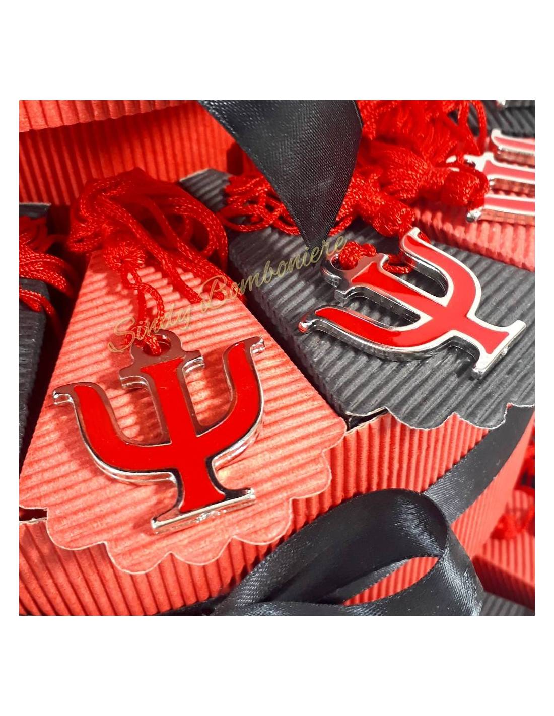 Bomboniere laurea originali idee per laurea in psicologia con confetti rossi compresi!Le bomboniere laurea raffigurano la lettera greca psi rossa su argento simbolo della psicologia, confezionati con scatoline nere per confetti torta bomboniera completa di nastro e fiocco di raso rosssi e in cima un tocco laurea con coccinella e il libro laurea. Gli oggettini laurea sono un ideali pensierini da regalare ad ospiti ed amici come ricordo della tua laurea, la struttura a forma di torta è molto scenografica da effetto vicino alla torta dessert per fare le foto.COMPLETA DI 5 CONFETTI E BIGLIETTINO PER OGNI OGGETTO. Materiale zama (tipo argento invecchiato),Dimensioni psi: 3 cm x 3 cm più la nappina rossa.INSERIRE I DATI PER IL BIGLIETTINO NELLO SPAZIO bigliettinoN.B. La torta arriverà montata e decorata con nastri come in foto, ma le fette verranno inserite da voi, facili da chiudere inserendo i confetti (5 confetti al cioccolato in blister per alimenti sigillato da una macchina confezionatrice IGIENE AL 100%) e poi con un pò di colla potrete attaccare gli oggetti autonomamente (consigliato colla al caldo, colla tipo attack o biadesivo) tutto questo per garantire l’integrità del prodotto.
