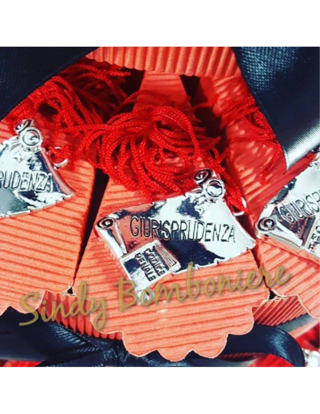 composta da fette con PERGAMENA argentata con nappina con scritta GIURISPRUDENZA adatta per chi si laurea in materie giuridiche (Dimensione: 3,5 x 2,5 cm circa)