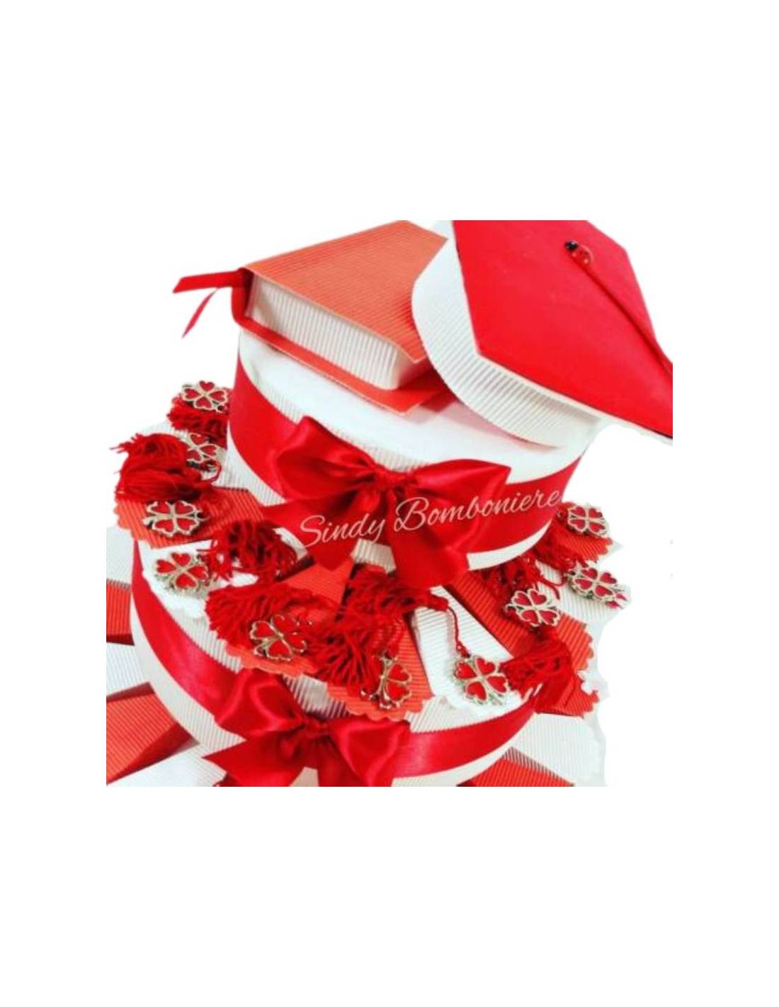 Torta laurea con struttura di colore bianco con nastro in raso rosso. Le fette sono di colore bianco e rosso e, insieme ad esse, sono presenti dei quadrifogli in microfusione (dimensione 4 cm circa) con nappina. Oltre alla bomboniera sono presenti anche confetti e bigliettini personalizzati.