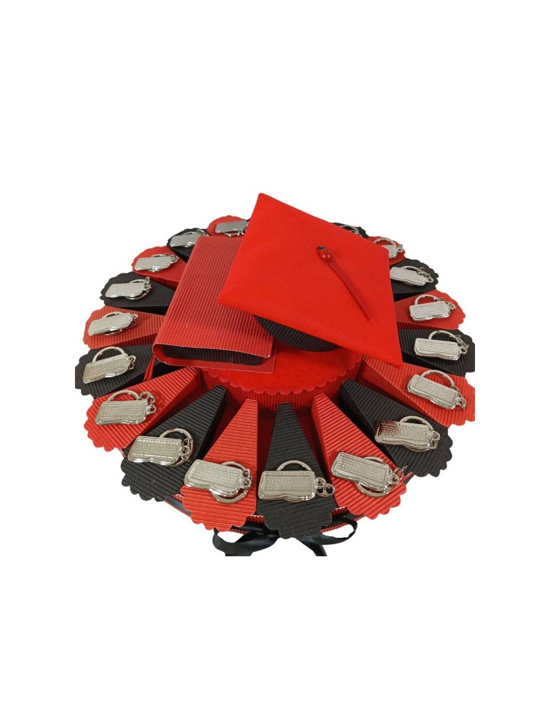 La torta è decorata a tema laurea informatica. è presente un simpatico portachiavi in microfusione a forma di tastiera di computer, oltre che a confetti e bigliettino . La struttura è di colore rosso e bianco e decorata con nastri e fiocchetti in raso rosso. In cima ad essa sono presenti un tocco e una tesina come centrale.