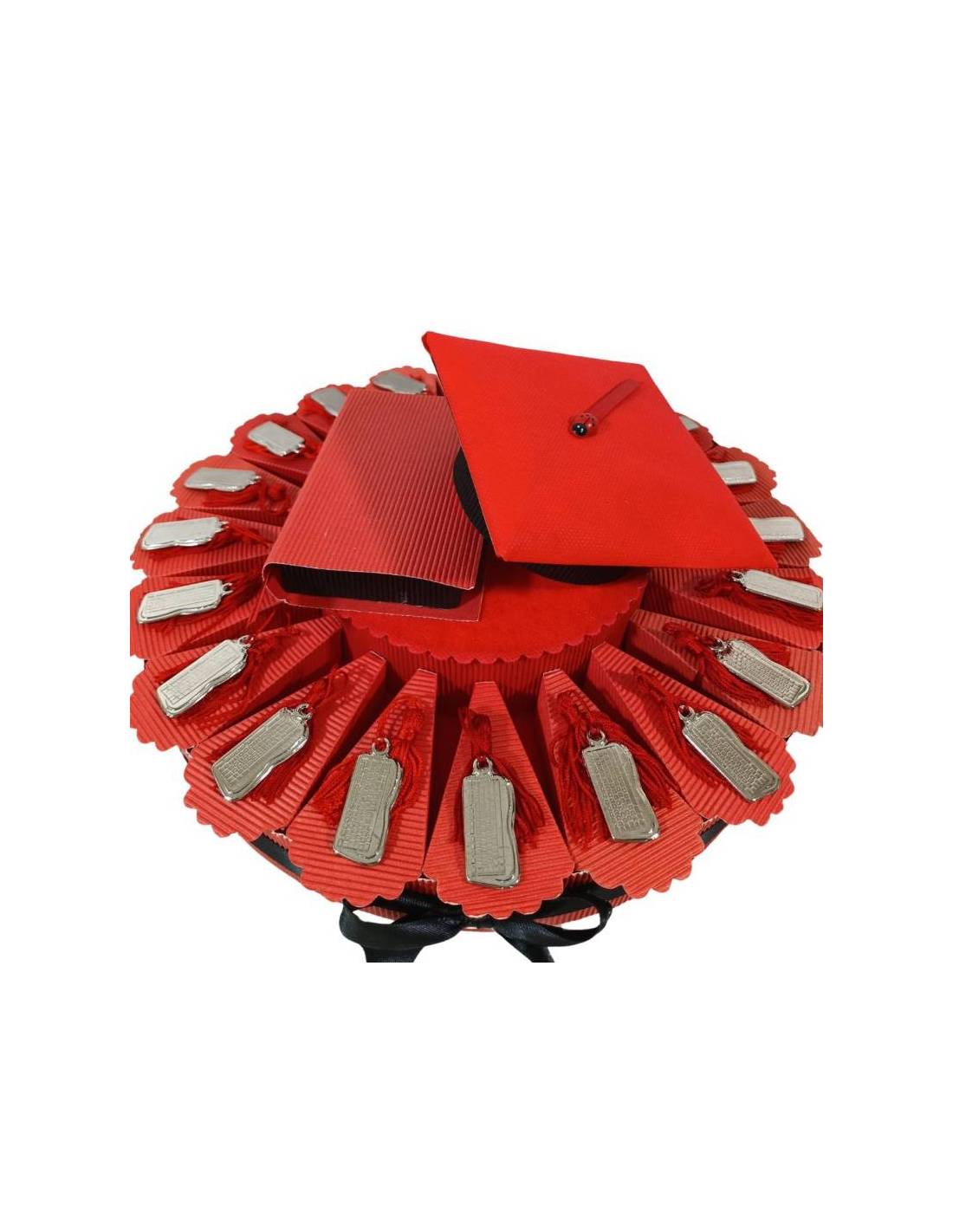 Torta porta bomboniere con tastierine in microfusione con nappina, presenti su ogni fetta della torta con bigliettino e confetti, e centrale con tocco con coccinella e libro. La torta è decorata con nastri e fiocchi rossi in raso.