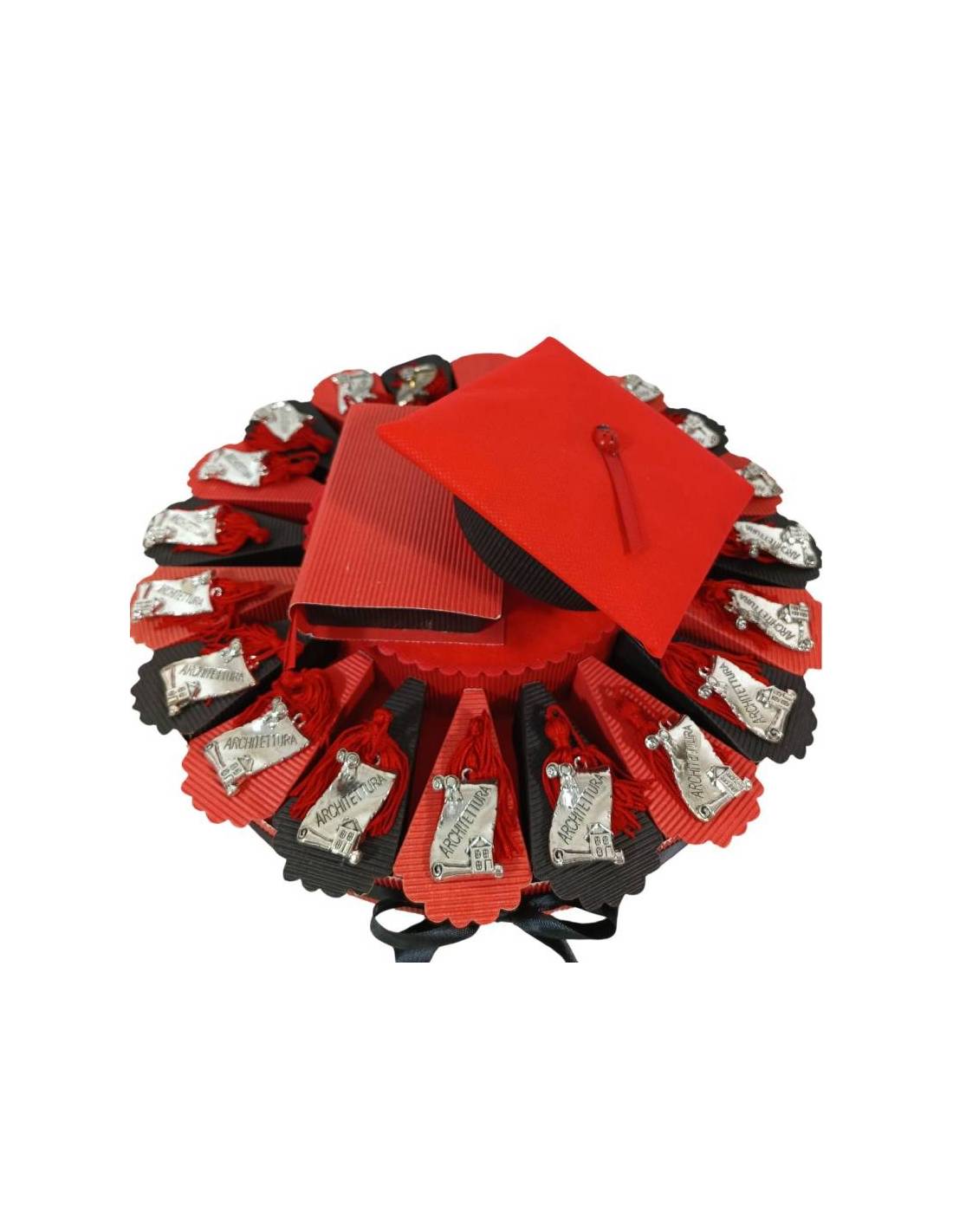 La torta è di colore bianco e rosso, colori che ricoldano quelli della laurea, decorata con nastri in raso rossi e fiocchi. Con ogni fetta sono presenti dei ciondoli targhette in zama, a forma di pergamena con su scritto "architettura", con nappina rossa. Come centrale sono presenti un tocco e un libro di colore rosso e bianco.