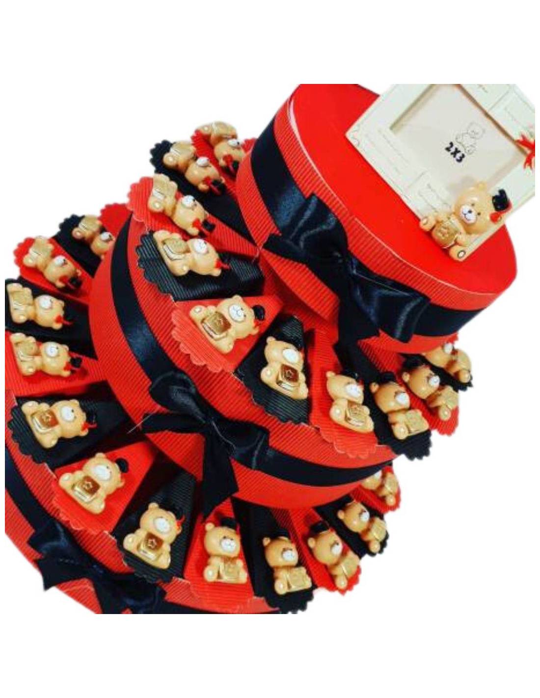 La torta è composta realizzata con i colori della laurea, quindi con i colori rosso e nero. Su ogni fetta sono presenti degli orsetti in resina con i mano un libricino dorato e con in testa un tocco nero.