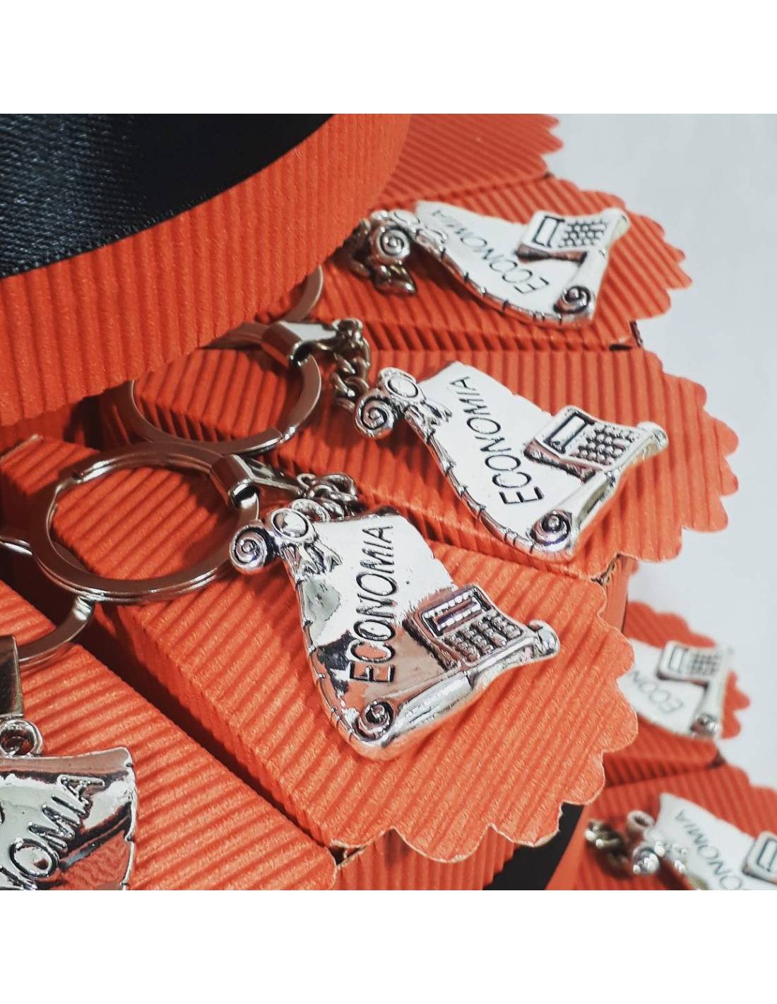 composta da fette con PERGAMENA argentata con Portachiavi con scritta Economia (Dimensione: 3,5 x 2,5 cm circa)