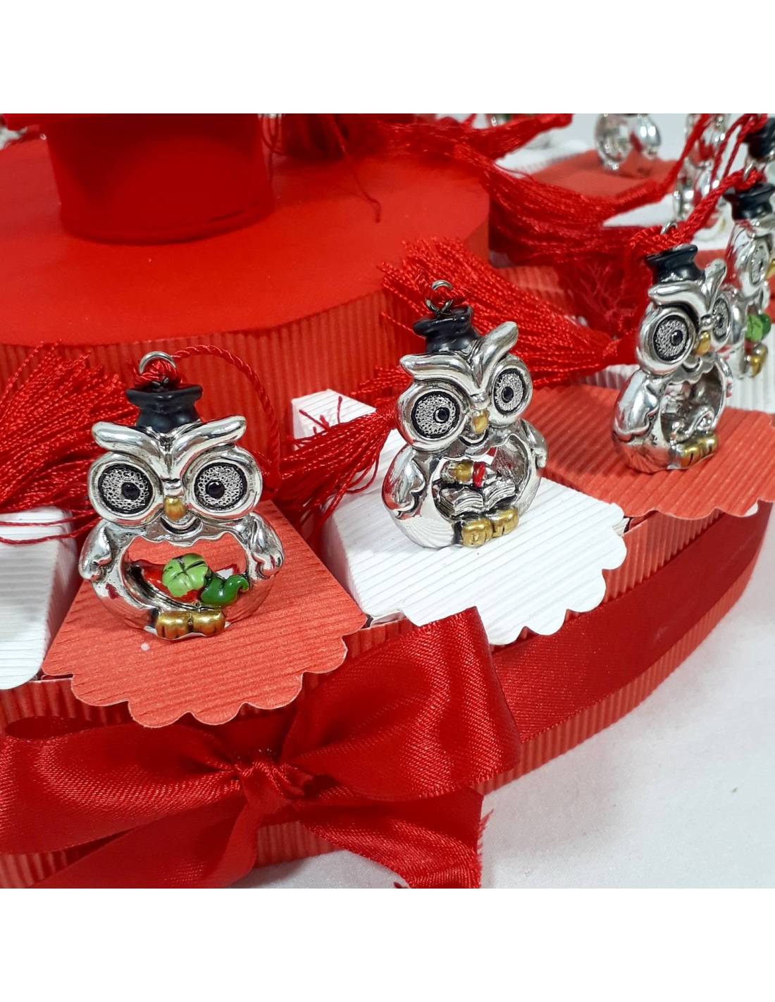 Torta bomboniera laurea con gufetti stilizzati argentati misti con nappa