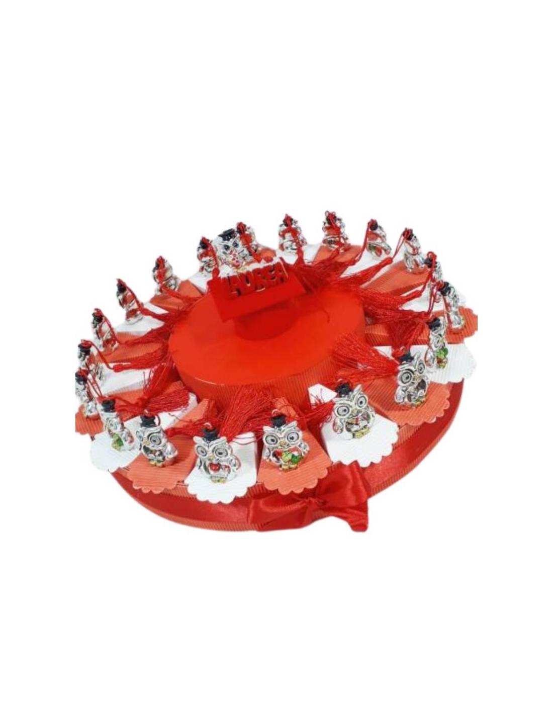 Bellissima torta porta bomboniere a tema laurea decorata con fiocchi e nastri in raso a tema laurea. Le fette presenti all'interno della struttura, contengono confetti e bigliettini, oltre ad essere accompagnati da un'oggettino da appoggio a forma di gufetto stilizzato argentato in resina argentata con nappa rossa.