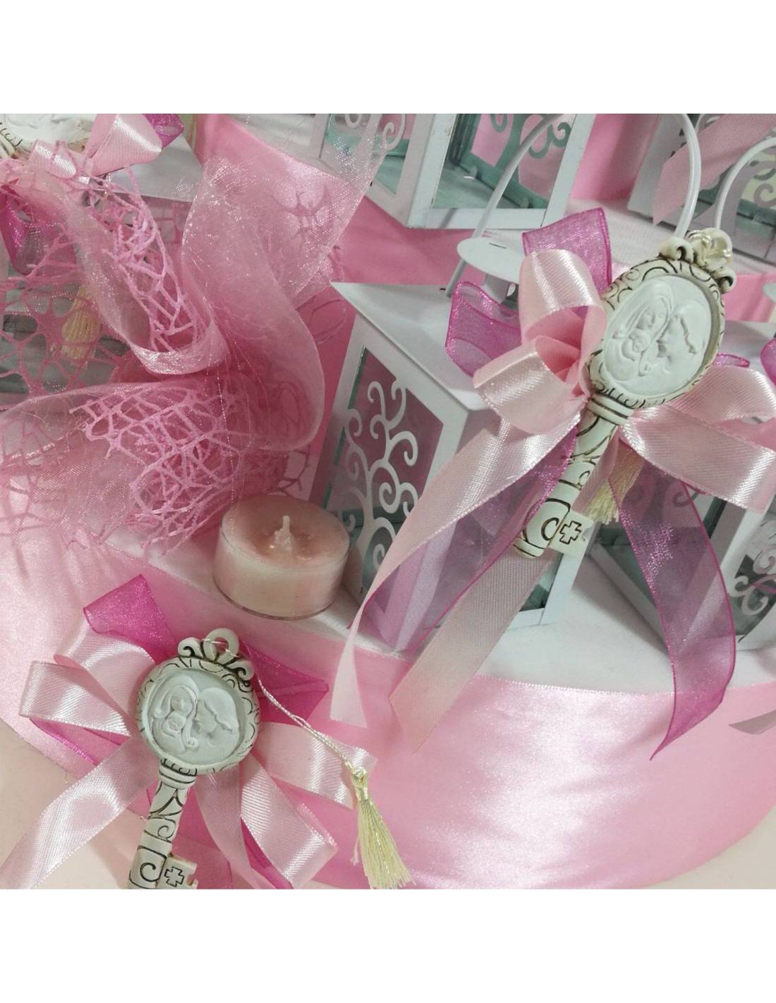 Ogni lanterna della torta di bomboniera Battesimo ha il magnete a chiave in resina completo di fiocco come in foto, il sacchetto con 5 confetti al cioccolato, una tealight e il bigliettino.