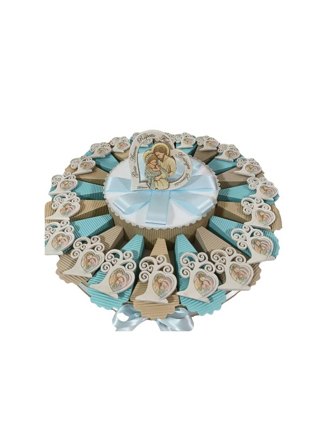 Torta bomboniera arricchita con chiavi in resina con placca argentata molto dettagliata con su raffigurata la sacra famiglia. sono presenti confetti e bigliettini personalizzati.