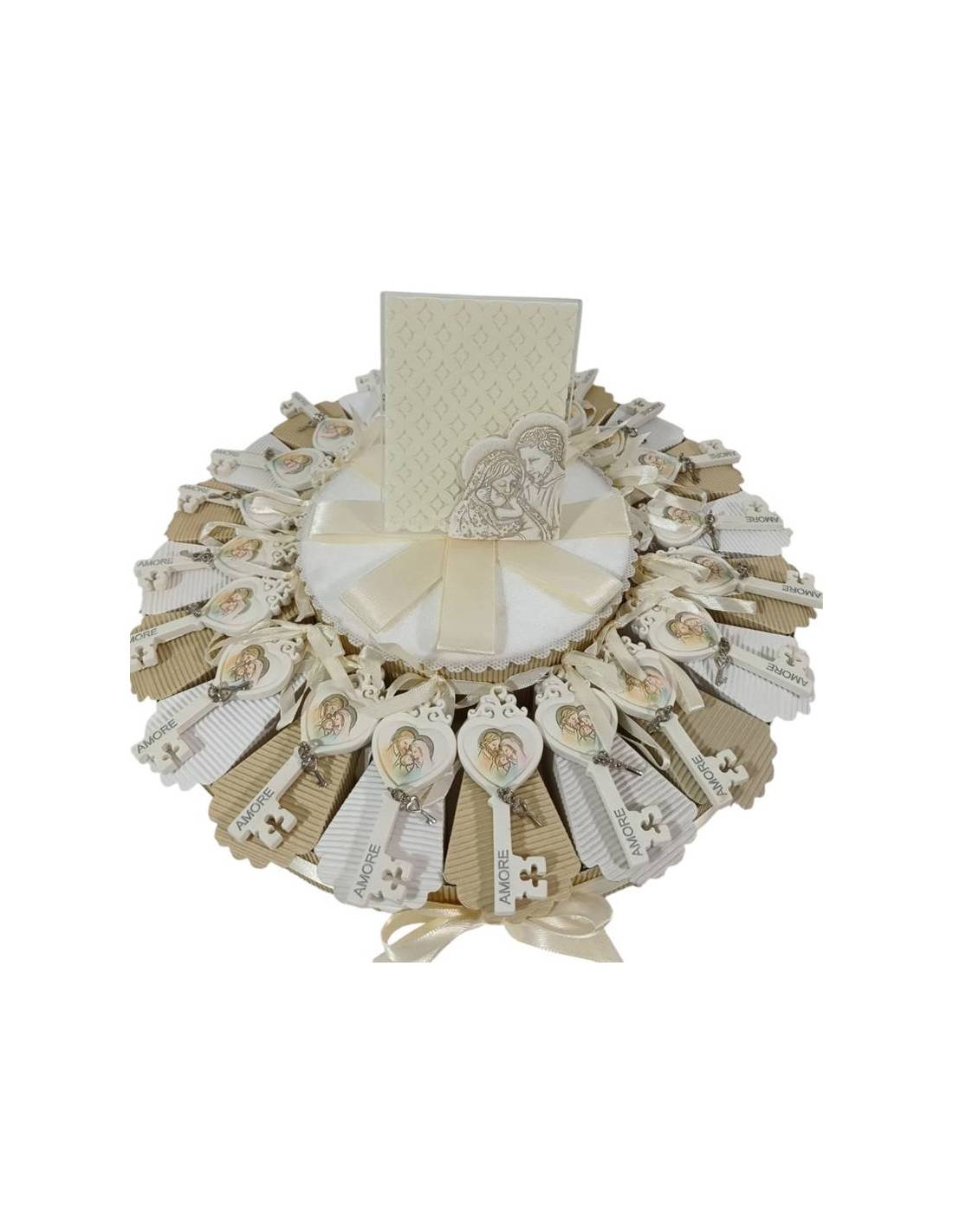 La Torta bomboniera ha un portafoto centrale, che è l’icona rappresentativa della Sacra Famiglia, e degli elementi capillari, che sono le fette di questa torta, ossia delle vere e proprie bomboniere: esse sono delle bellissime e significative chiavi sacre.