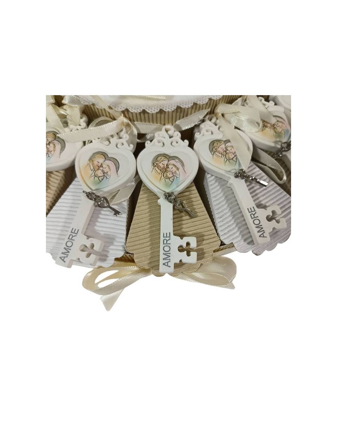 TORTA bomboniera con chiavi sacre con immagine di Sacra Famiglia con scritta incisa la parola AMORE 049650
