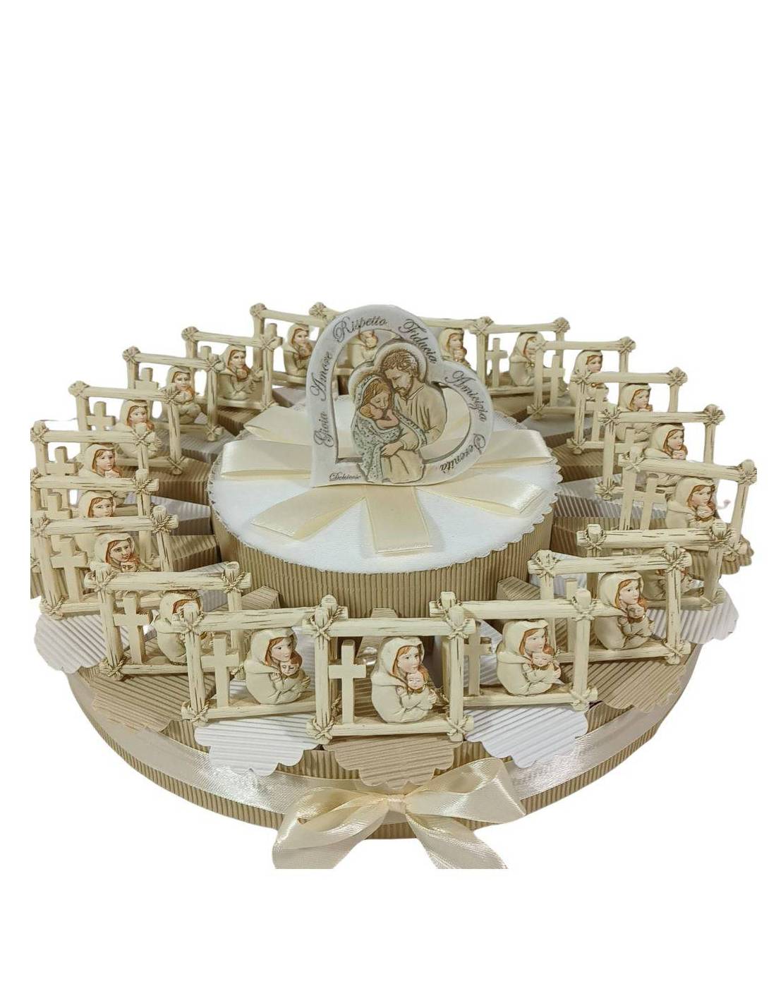 Questa bellissima e scenografica torta bomboniera comprende confetti, bigliettino e quadretto che raffigura l'immagine sacra della Natività. Inoltre, compreso nel prezzo è presente un centrale