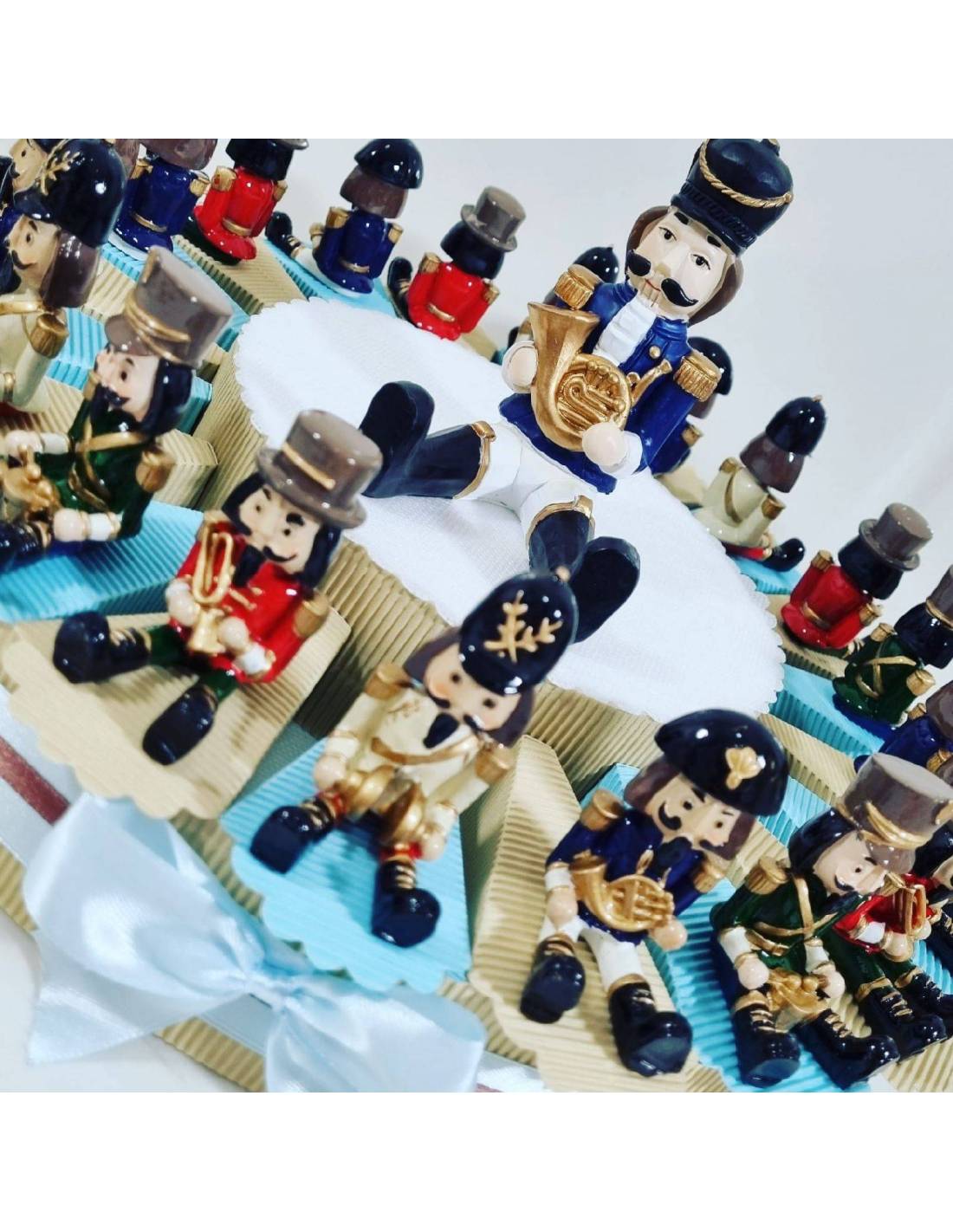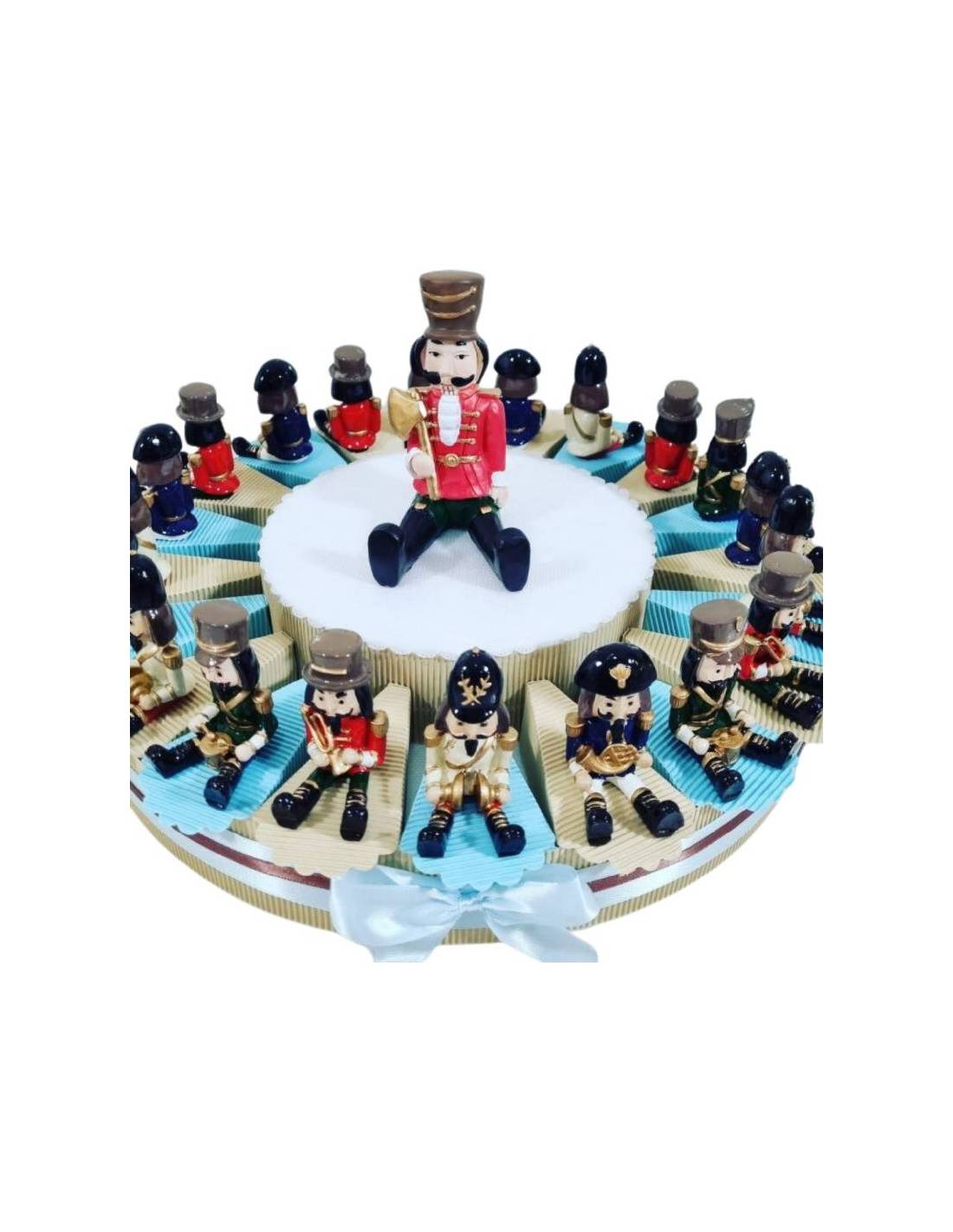 Soldatini colorati in piedi con divisa e strumenti tra le mani proposti su torta di bomboniere completa.