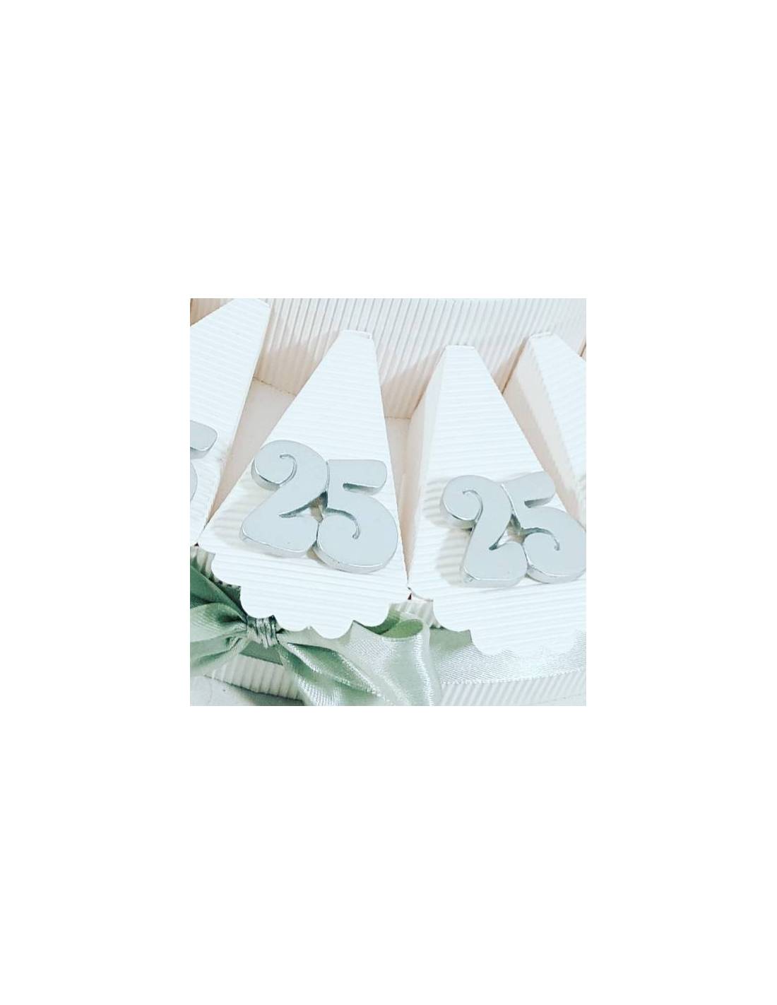 Torta bomboniera per anniversario di matrimonio con confetti e bigliettino all'interno di ogni fetta. Su ognuna di esse è presente un magnete in resina a forma di 25 di color argento (dimensione 2 x 2,5cm circa).