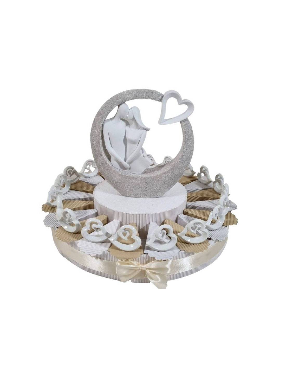 Puoi confezionare con le tue mani la torta di bomboniere matrimonio cuori statuette in quanto la struttura è montata e decorata con nastri, basterà chiudere le fette e attaccare gli oggetti.