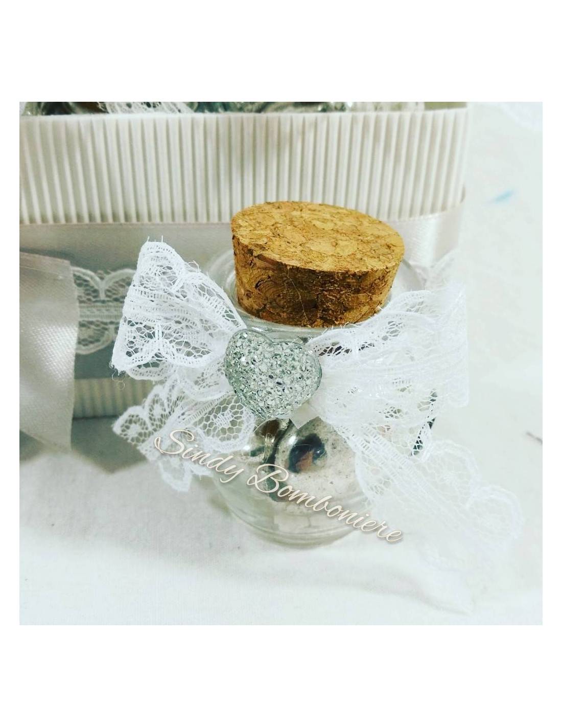 composta da vasetti ad anfora in vetro con tappo di sughero decorati accuratamente con nastrino in raso bianco e un cuoricino al centro del fiocco