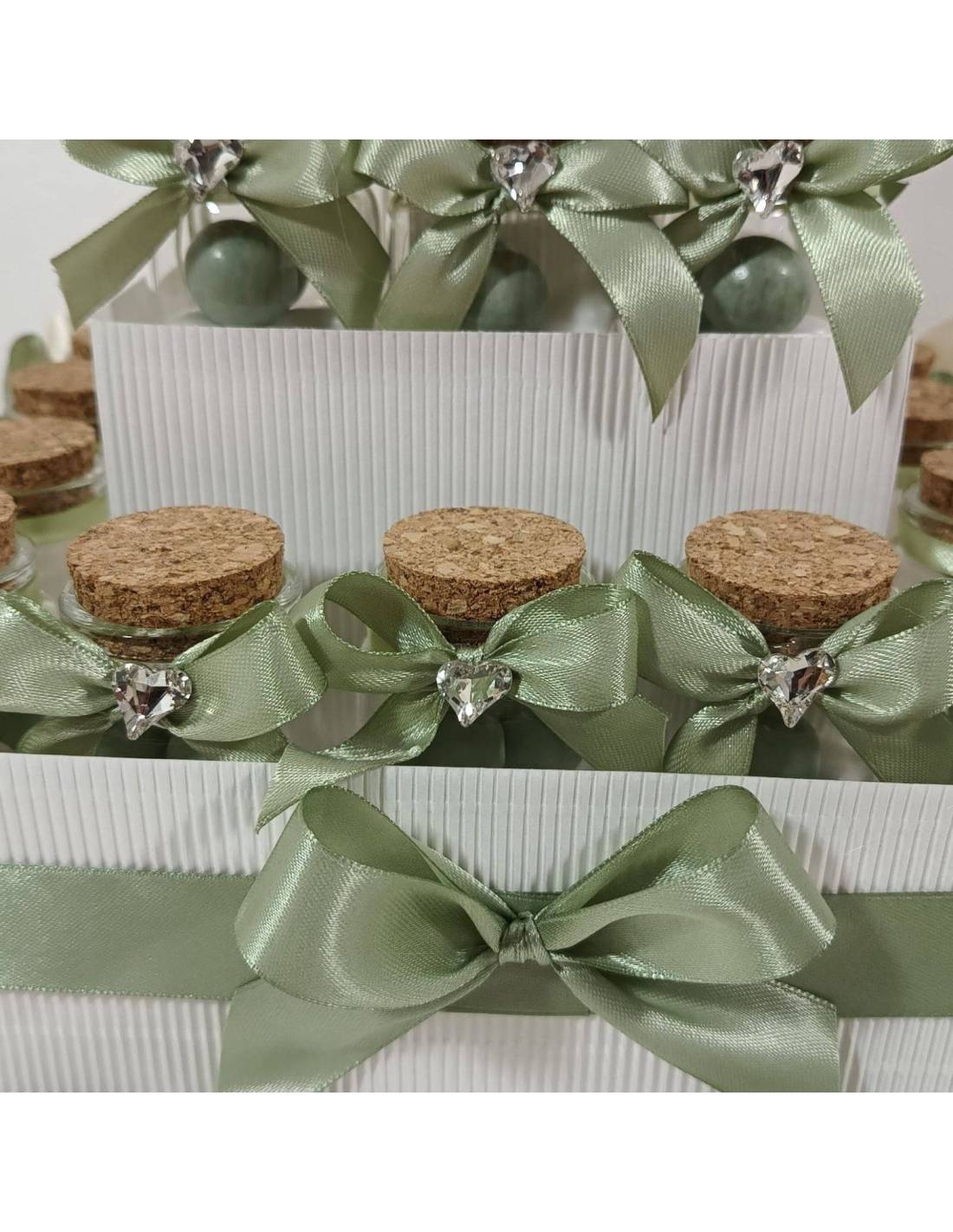 composta da vasetti barattolini in vetro con tappo di sughero decorati accuratamente con nastrino in raso e un cuoricino al centro del fiocco