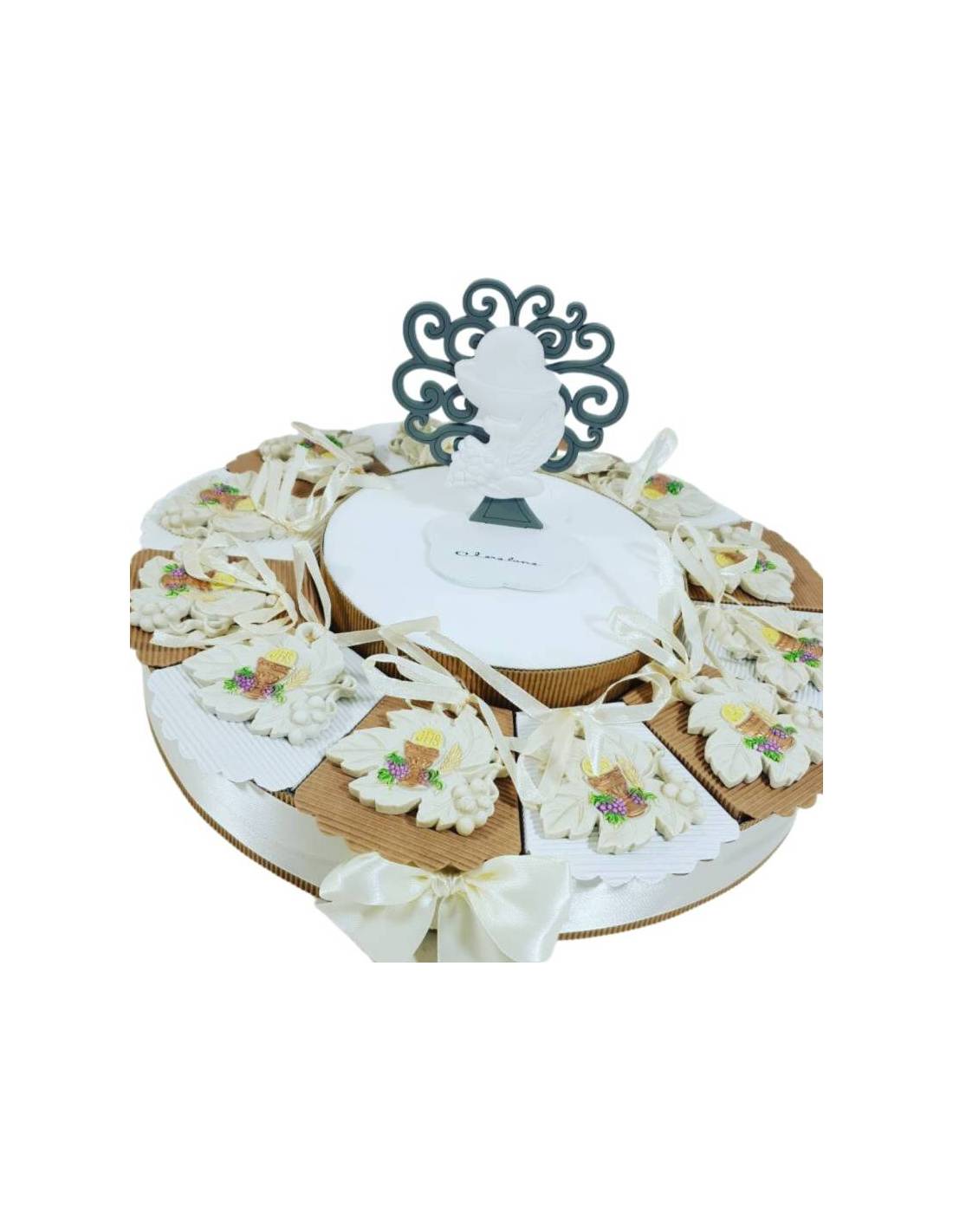 Torta portaconfetti Comunione completa di 5 confetti e bigliettino personalizzato per ogni fetta.