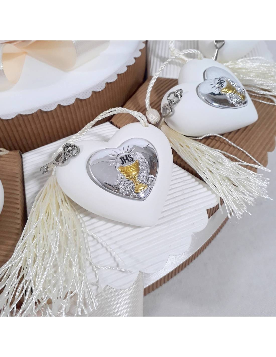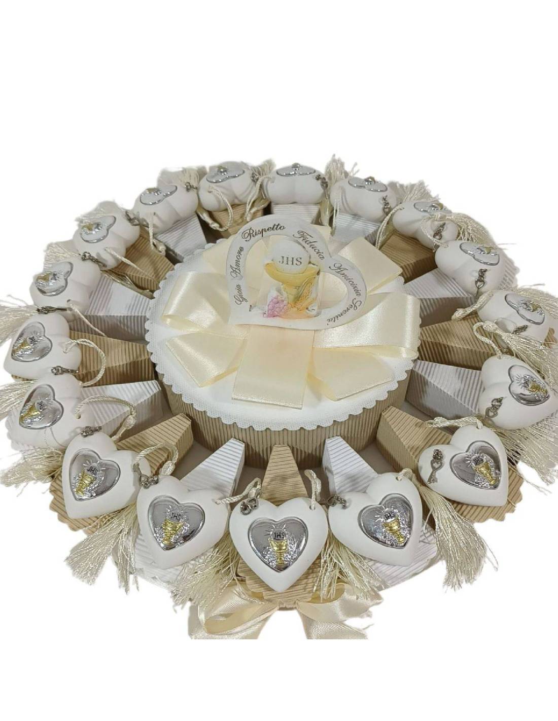 Questa torta bomboniera Comunione cuore è composta da cuori bianchi con Calice argentato e dorato e chiave piccola a pendente con nappa color panna.