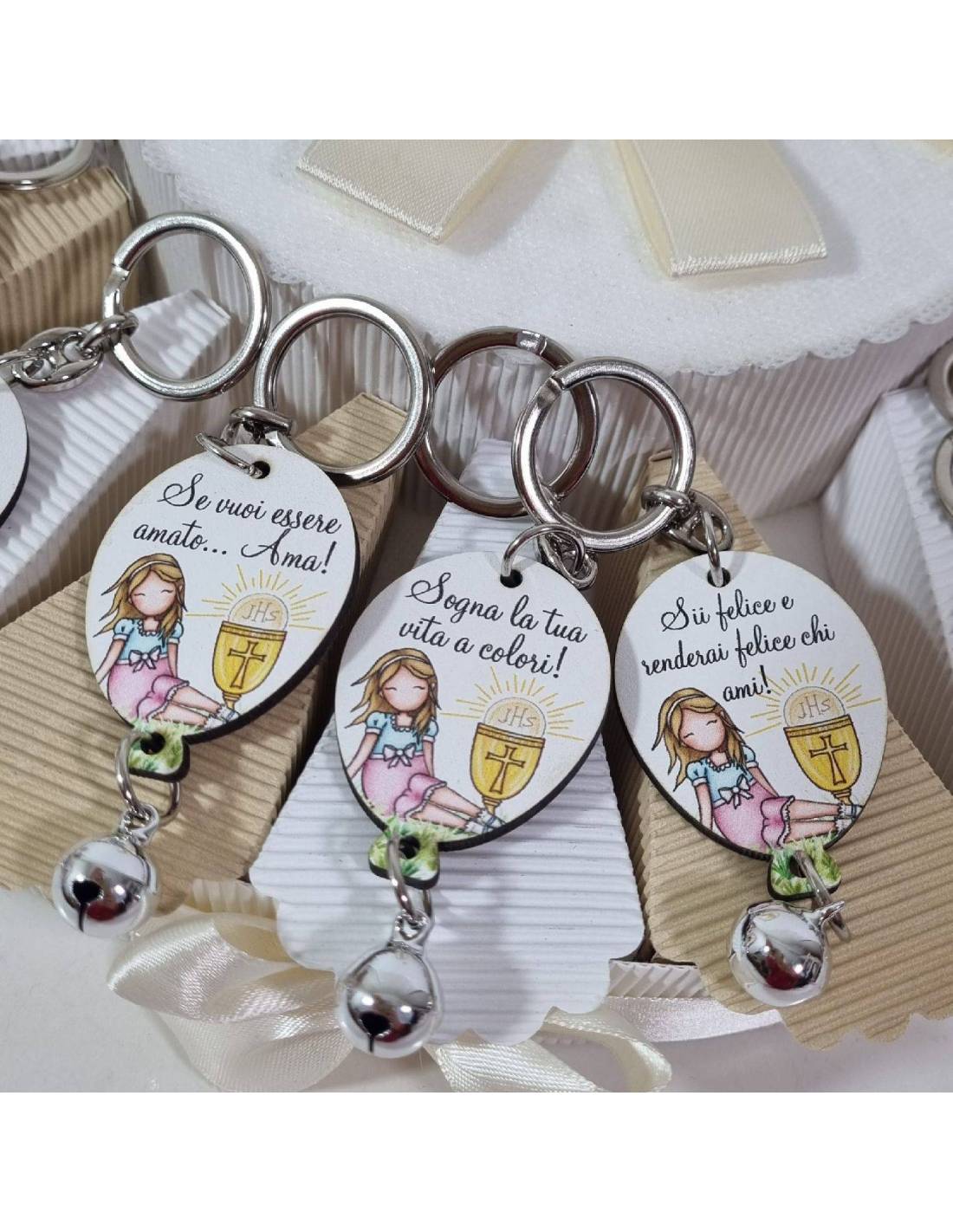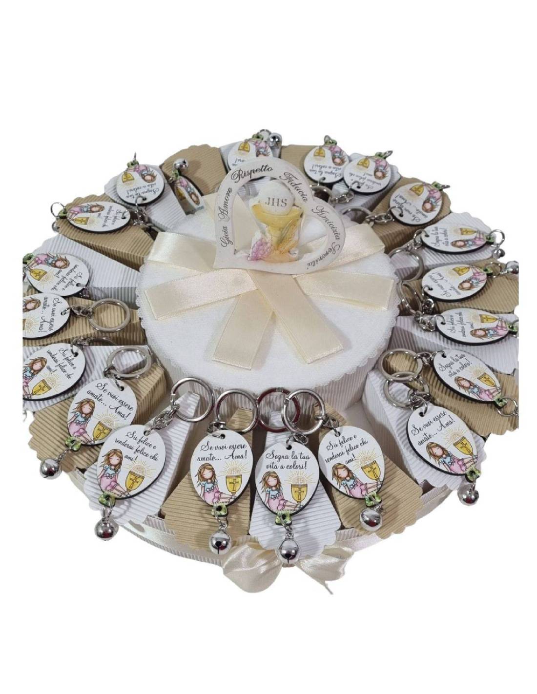 I portachiavi della torta portaconfetti Comunione hanno un campanello.
