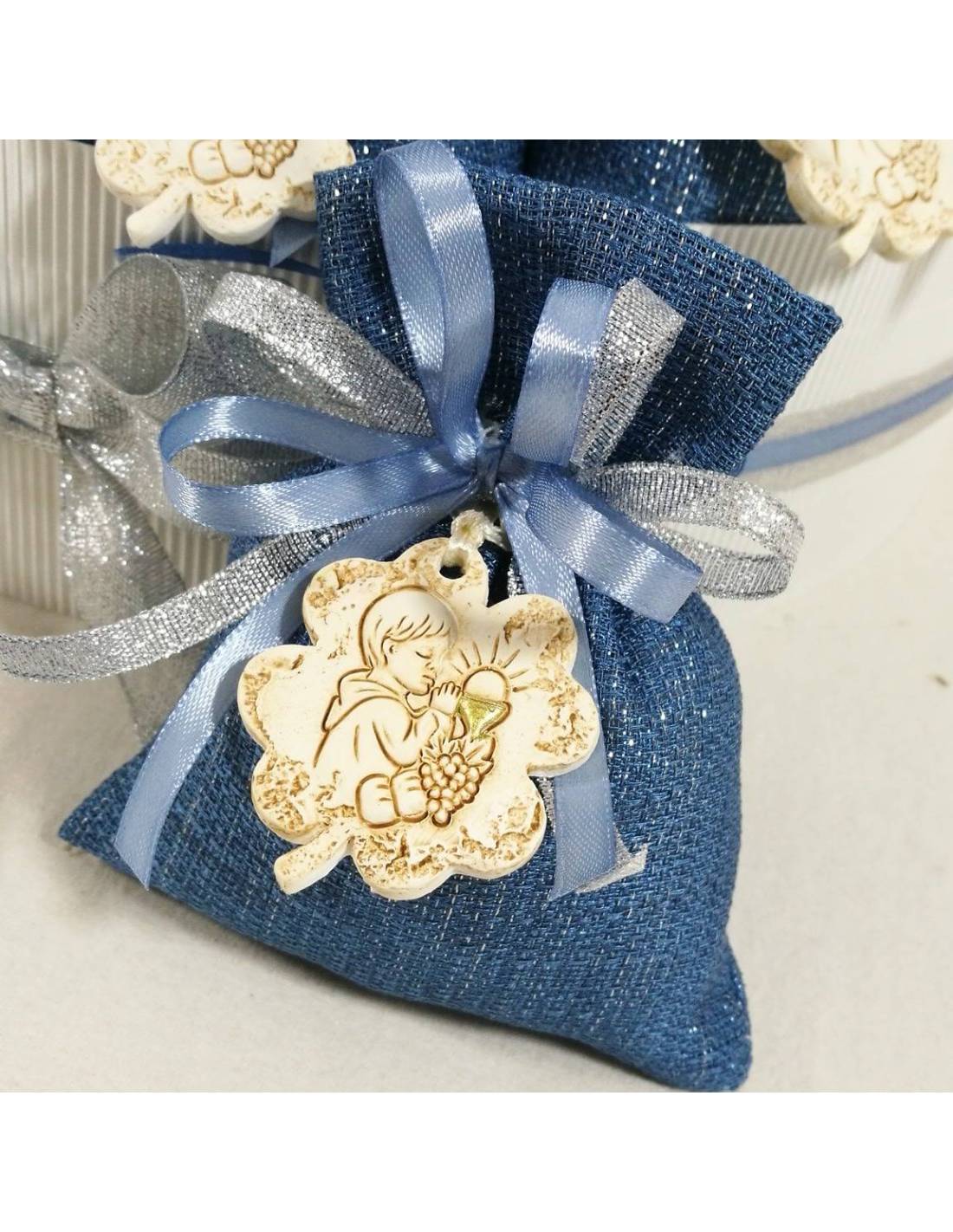 Torta sacchetti bomboniere Comunione bambino con magnete angioletto e nastro morbido in juta completa di 20 pz e centrale.