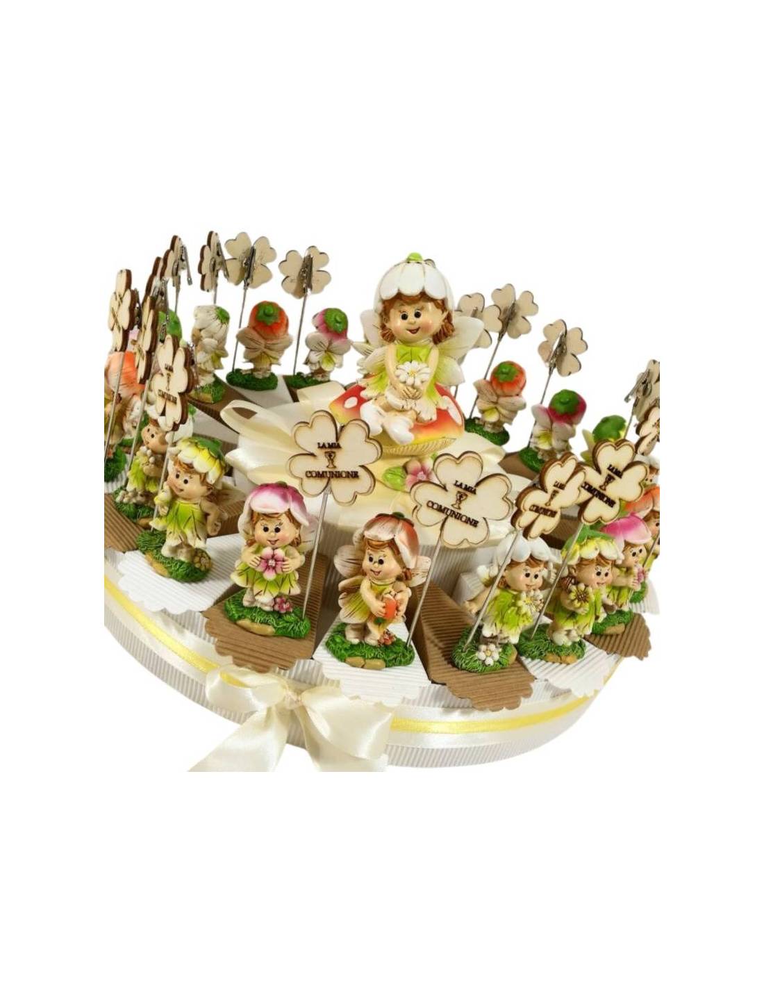 Torta di bomboniere Comunione per bambina con simpatiche fate che hanno sulla clip il quadrifoglio a magnete.