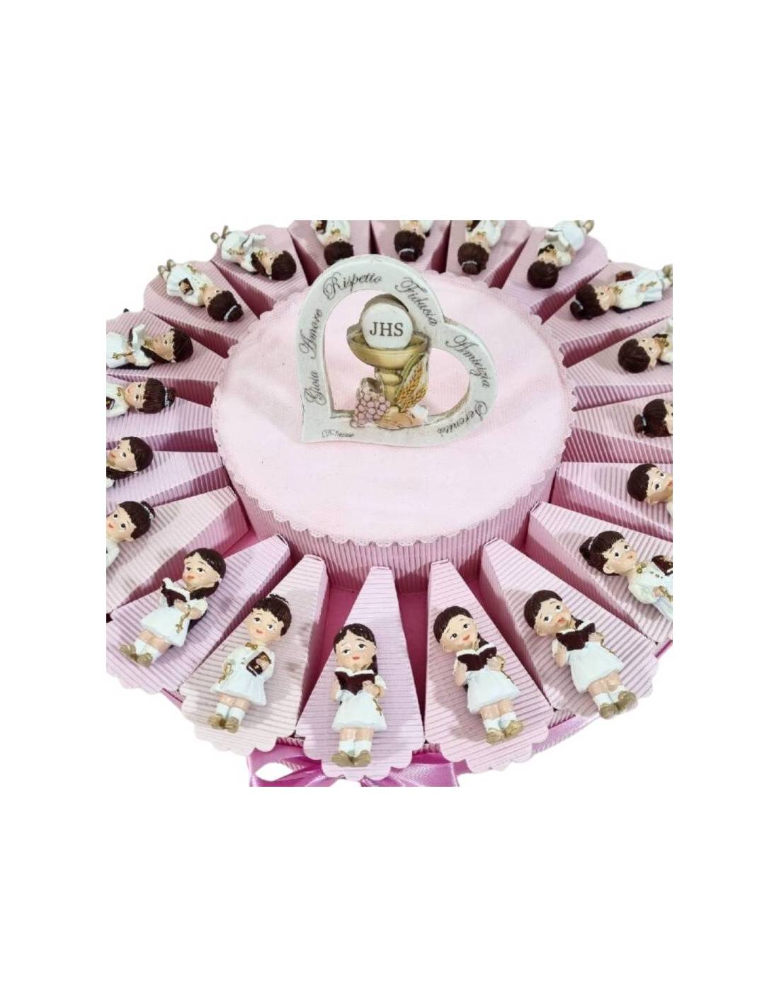 La torta porta bomboniere Comunione magnete bimba comprende il bigliettino e i confetti (5 confetti  al cioccolato in blister per alimenti sigillato da una macchina confezionatrice IGIENE AL 100%).