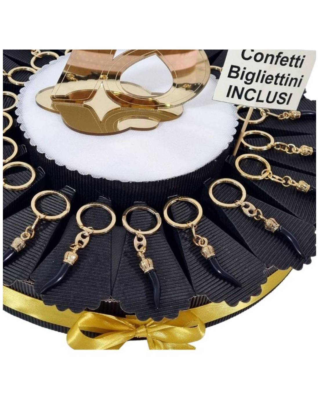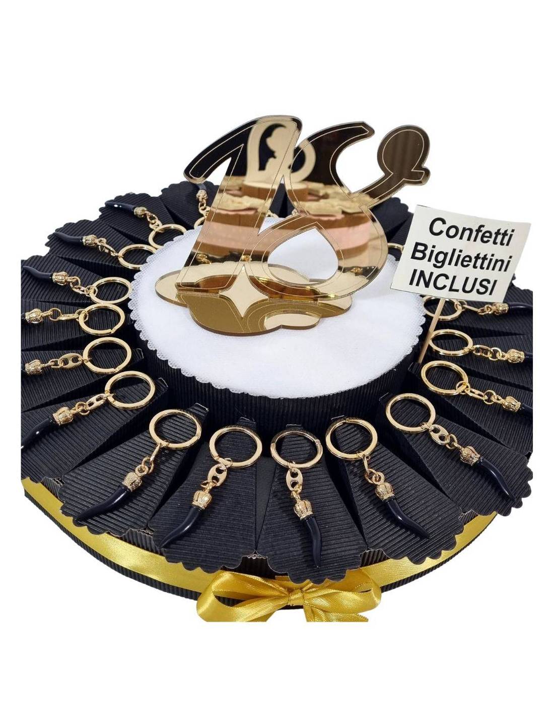 Torta di bomboniere 18 anni cornetti portafortuna in metallo nero e dorato