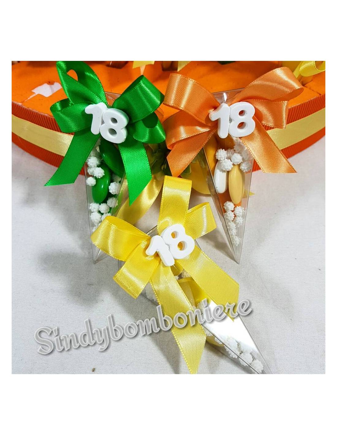 Gessetti originali a forma di numero 18 confezioati su scatoline portaconfetti a forma di cono in plexiglass con confetti e mimose dai colori abbinati con nastri delle scatoline stesse.