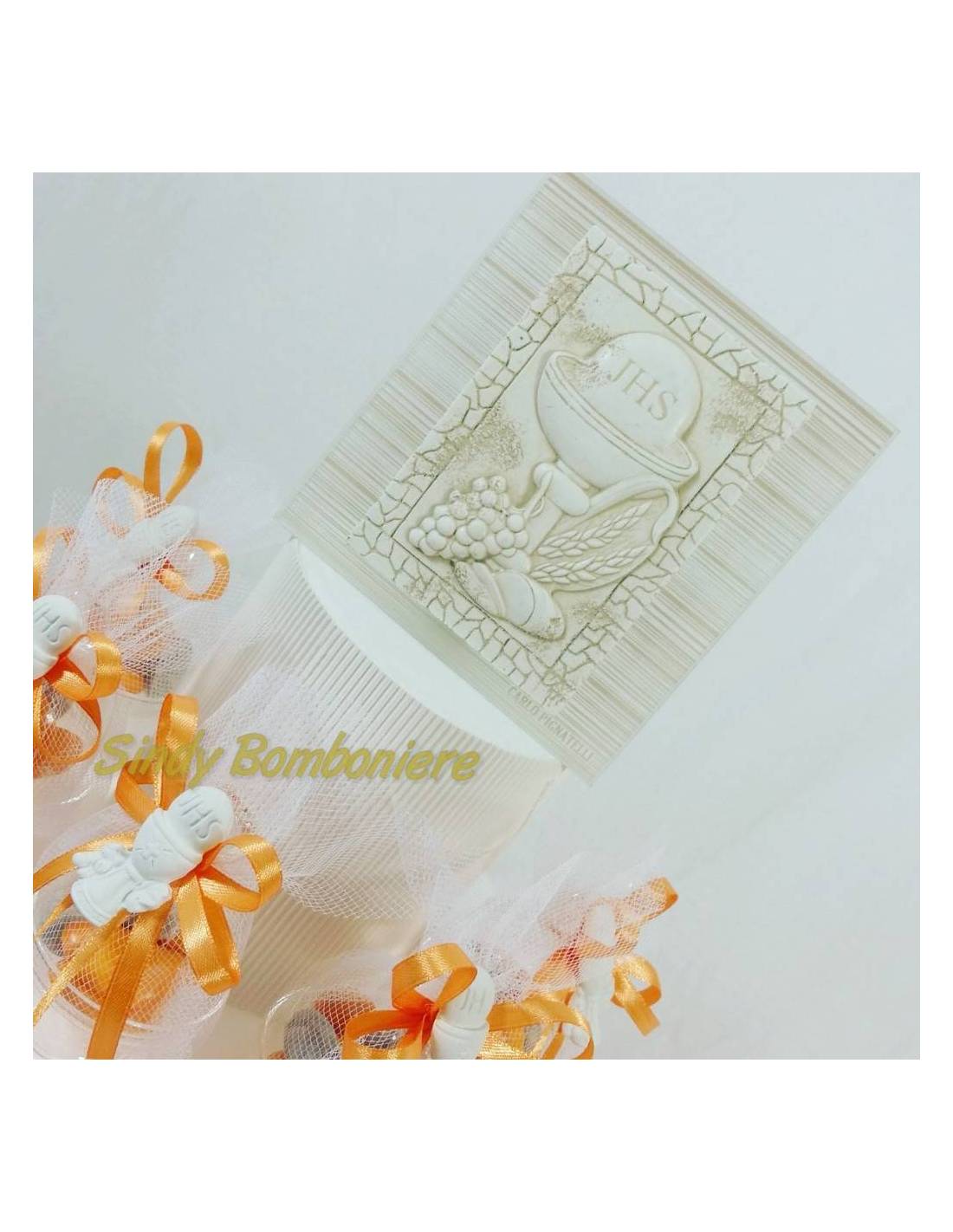 Ogni alzatina è decorata con nastrino arancione con fiocco, tulle e con applicazione in gessetto profumato di immagine religiosa.