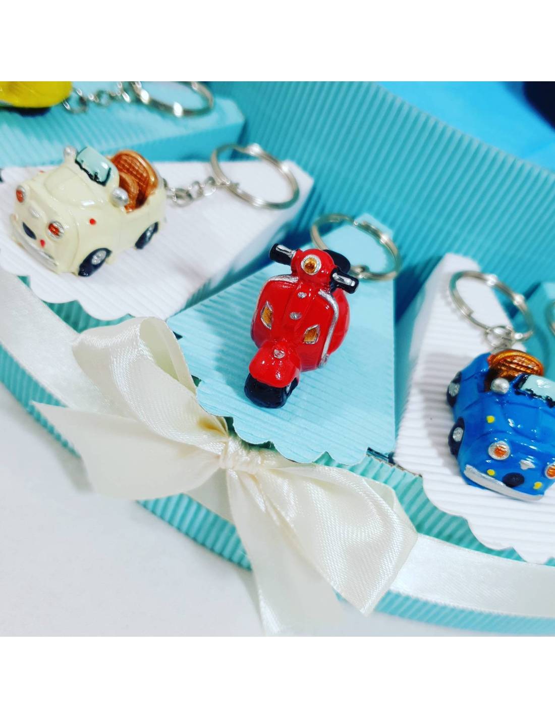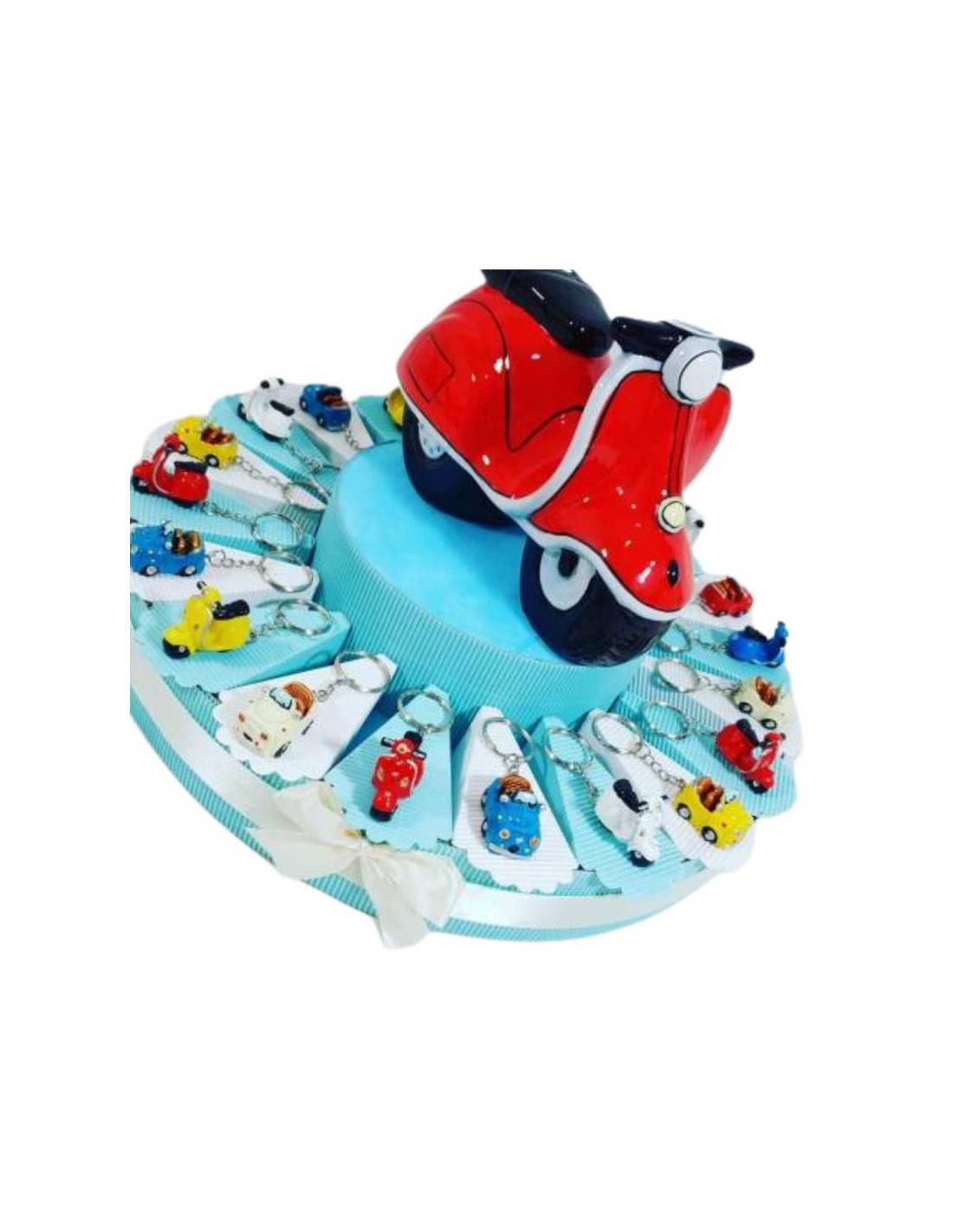 Torta Bomboniere vespe/auto 500 portachiavi colorati per cresima comunione compleanno