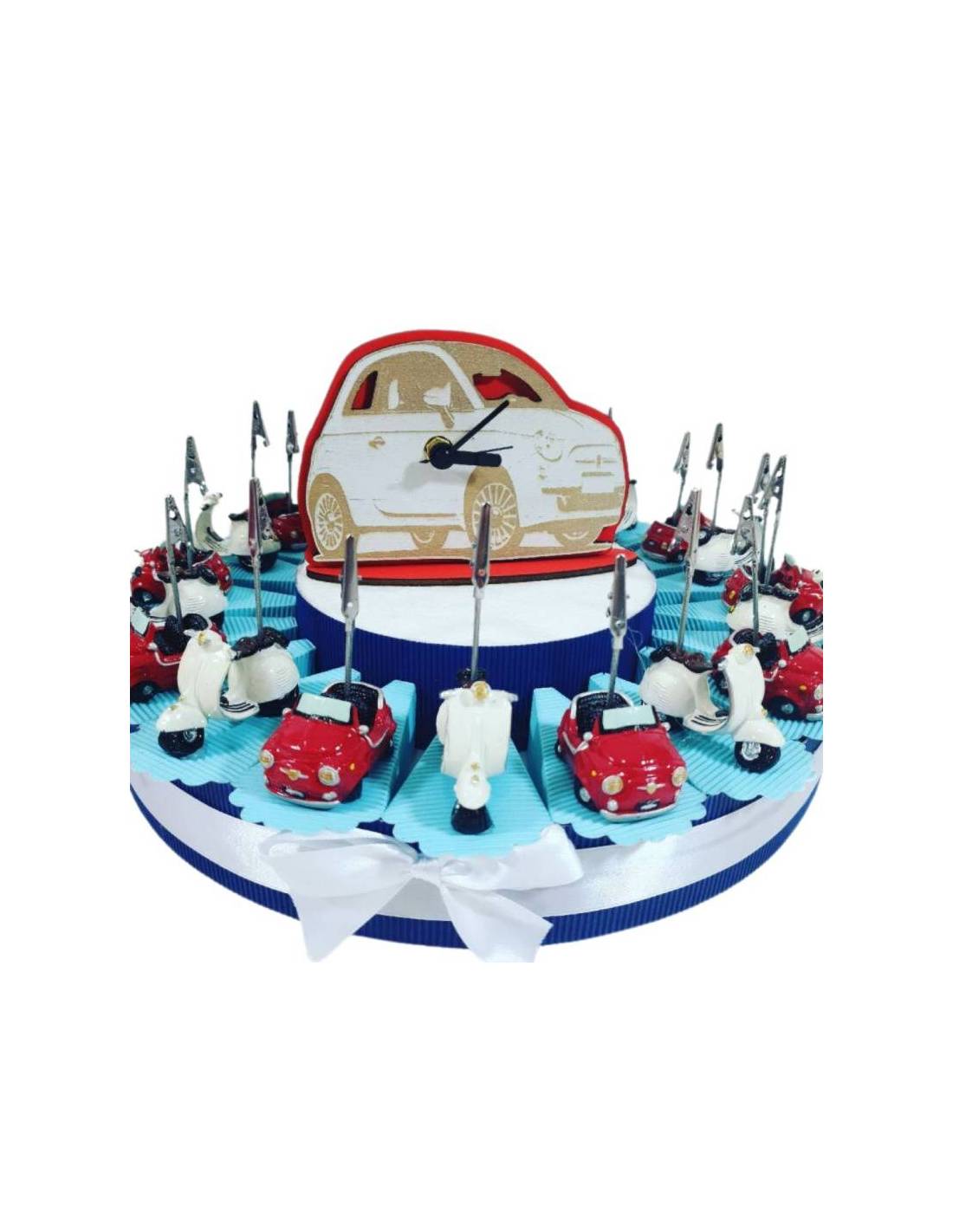 Torta bomboniera con vespette/auto 500 portachiavi con colori assortiti (blu, bianco, giallo e rosso) realizzati in resina. All'interno di ogni fetta sono presenti 5 confetti della Crispo al cioccolato e un bigliettino personalizzato a seconda dell'evento. Compreso nel prezzo è presente un centrare, realizzato sempre in resina, a forma di vespa simile a...