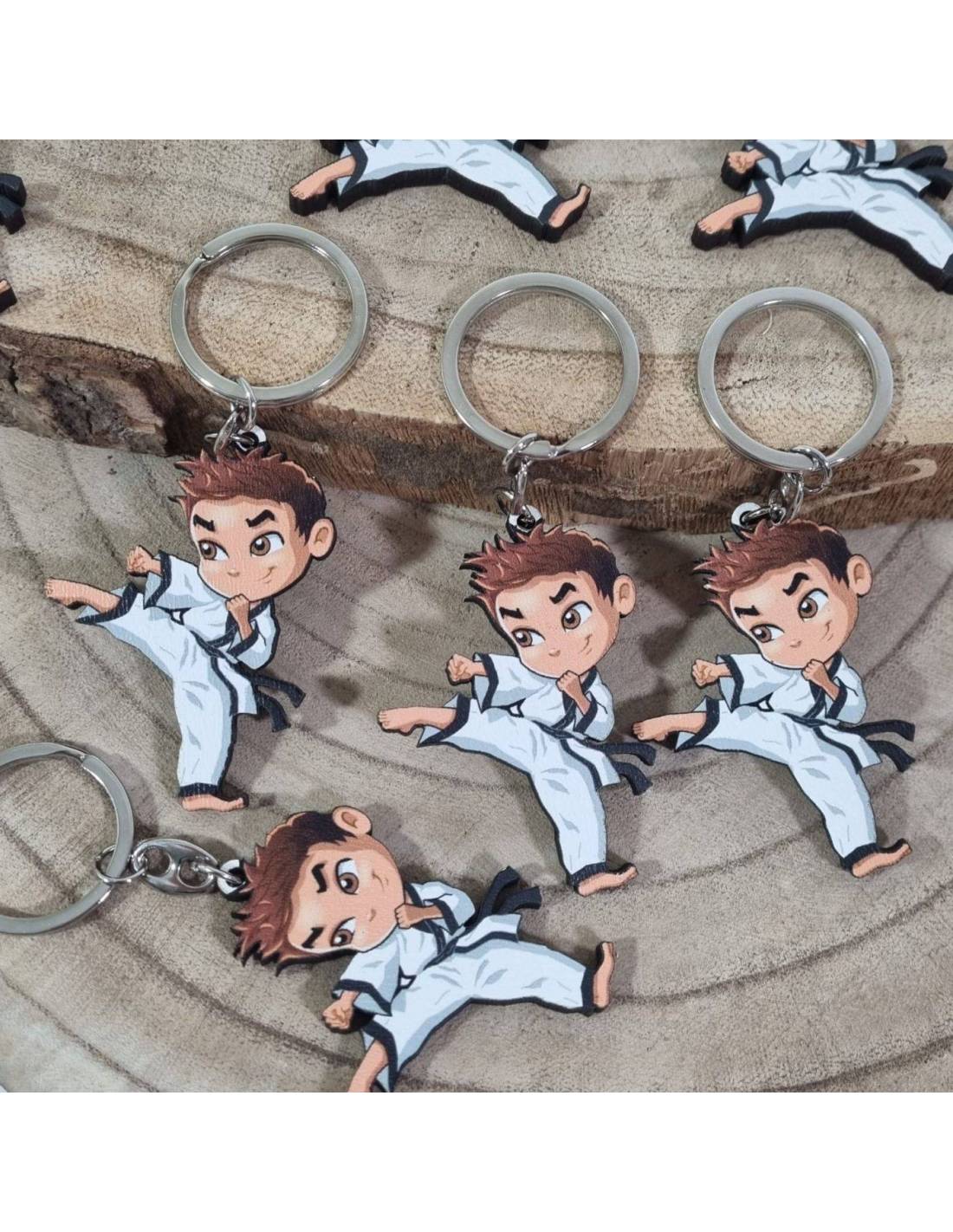 Portachiavi in acciaio e legno che raffigura un ragazzo in lotta con divisa e cintura nera.